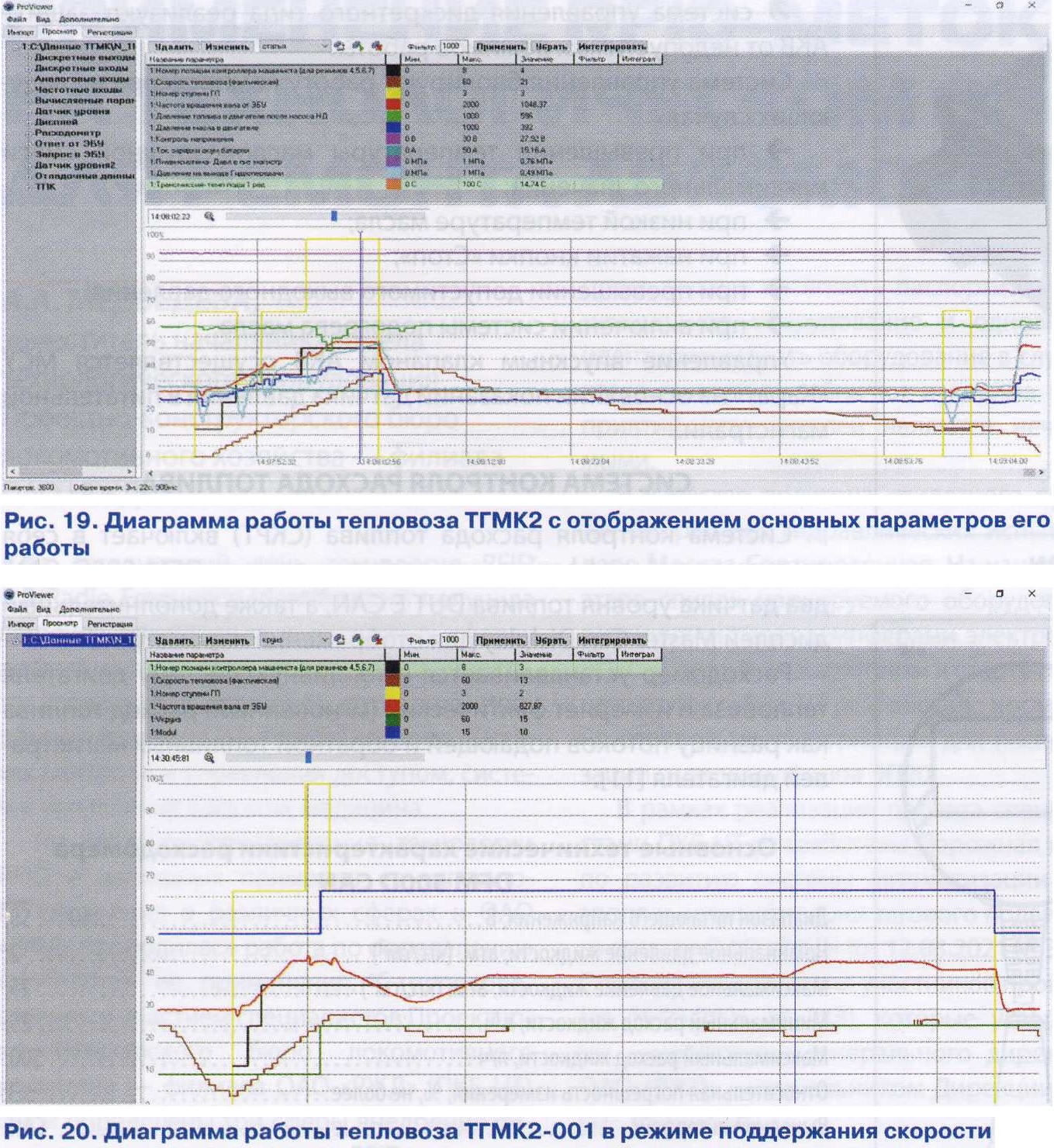 ![]() ИСПЫТАНИЯ Тепловоз ТГМК2-001 успешно прошел испытания на базе испытательного центра АО «ВНИКТИ» в Коломне. На тепловоз получен сертификат соответствия требованиям ТР ТС 001/2011 «О безопасности железнодорожного подвижного состава». После сертификации тепловоз в условиях опытного пробега на металлургическом предприятии в Таганроге подтвердил все основные технические характеристики. Данный локомотив может эксплуатироваться как на путях промышленных предприятий, так и ОАО «РЖД». ДИАГРАММЫ РАБОТЫ ТЕПЛОВОЗА На рис. 19 приведена диаграмма работы тепловоза с отображением основных параметров его работы. Данные регистрируются в ПЗУ дисплейного модуля, откуда могут быть считаны через специальный сервисный разъем на USB-носитель. Для расшифровки диагностической информации АО «ВНИКТИ» разработано прикладное программное обеспечение, которое позволяет представить записанные данные в графическом виде. На рис. 20 приведена диаграмма работы тепловоза ТГМК2 (заводской № 001) в режиме поддержания скорости. Алгоритм круиз-контроля включается машинистом нажатием соответствующей кнопки на пульте управления, после чего МСУ поддерживает скорость с точностью ±2 км/ч от заданной (УКруиз). Постоянство скорости достигается путем регулирования частоты вращения двигателя, а также переключения ступеней скорости при необходимости. ![]() ЗАКЛЮЧЕНИЕ Новый перспективный маневрово-вывозной тепловоз ТГМК2 обладает следующими техническими особенностями, отличающими его от ранее выпускавшихся локомотивов: