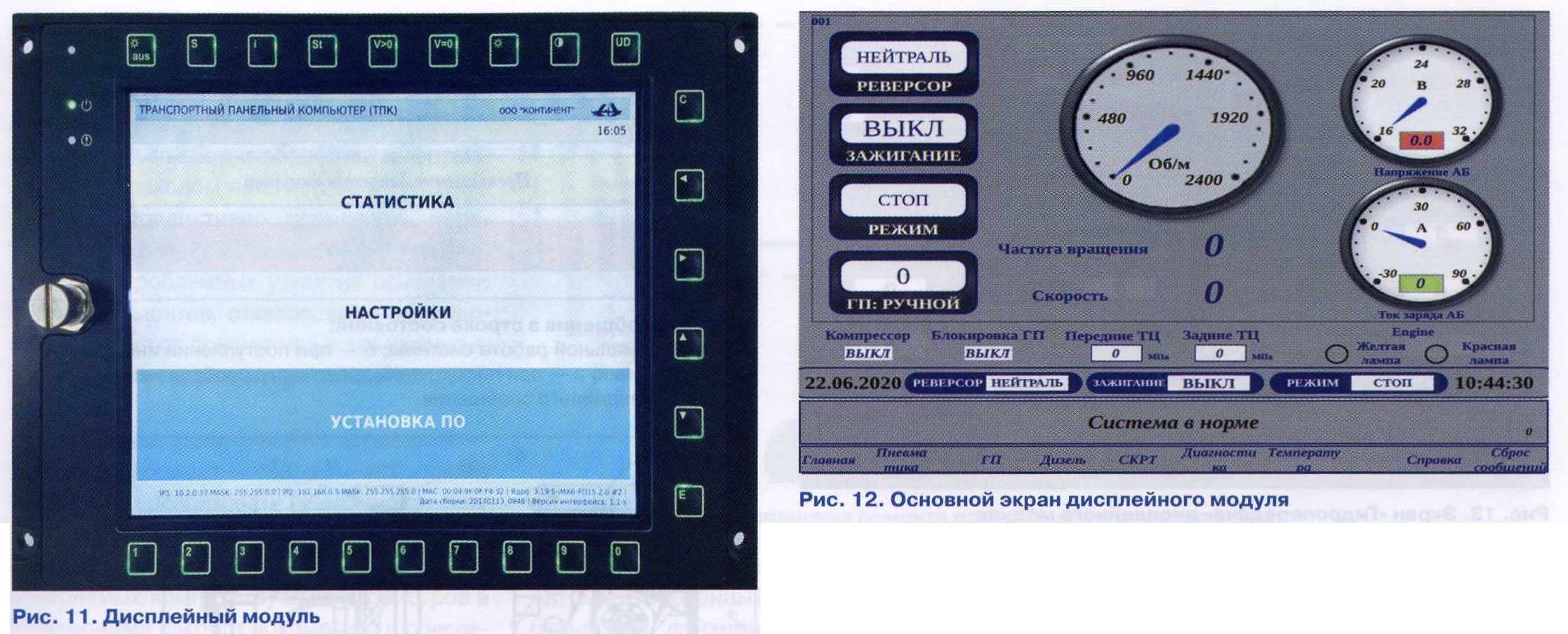 Дисплейный модуль предоставляет машинисту удобный доступ ко всей диагностической информации, отображает текущее состояние органов управления, основных и вспомогательных систем, а также выдает текстовые сообщения различных типов для информирования оператора (рис. 11). Вид основных экранов дисплейного модуля представлен на рис. 12 — 14. Для наглядности поля, в которые выводятся основные измеряемые величины, подсвечиваются различными цветами в зависимости от принимаемых значений: