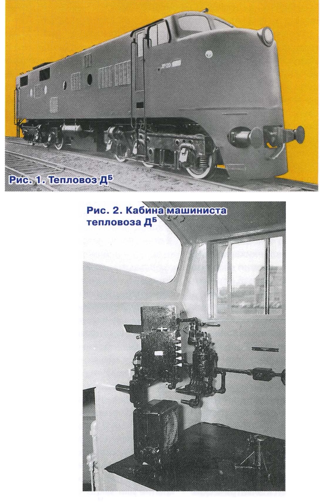 Во время Второй мировой войны компании Baldwin было запрещено выпускать магистральные и пассажирские тепловозы из-за введенного Советом военного производственного контроля США в 1942 г. Выпуск был разрешен только паровозов и маневровых тепловозов, без каких-либо усовершенствований и модернизаций. При описании типов тепловозов применено заводское обозначение. Эта система обозначения использовалась с 1939 г. Тепловозы типа 0-6-6-0-1000/1 DE 1-30 (тепловозы ДБ, рис. 1). Приемку локомотивов и другого железнодорожного оборудования для СССР в США осуществляли инженеры локомотивного главка НКПС В.В. Иванов и Н.И. Будников, а также сотрудник ЦНИИ НКПС Е.Г. Луценко, которые находились в то время там постоянно. Решение о поставке тепловозов было принято локомотивным главком НКПС с обязательным участием и консультацией видного специалиста-тепловозника П.В. Якобсона. Военным ведомством через правительство США компании Baldwin было разрешено построить 30 тепловозов для железных дорог СССР. Эти поставки были включены в программу ленд-лиза. Род службы тепловоза — грузопассажирский. Кабина машиниста (рис. 2) и машинное отделение образовывали единую конструкцию, состоящую из стальных листов, приваренных к стальным лонжеронам, которые, в свою очередь, приварены к раме локомотива. Пульт управления машиниста расположен с правой стороны кабины носового отсека. Большие передние и боковые окна, застекленные безопасным стеклом, обеспечивали исключительно хороший обзор. Передние окна оборудованы стеклоочистителями, антиобледенителями и солнцезащитными козырьками. В кабине машиниста установлены два электрических обогревателя (со стороны машиниста и помощника). Люки в крыше машинного отделения позволяли снять дизельный двигатель в сборе с генераторами и вспомогательным оборудованием. Дополнительные люки в крыше обеспечивали доступ к отдель- ным цилиндровым группам для обслуживания и регулировки двигателя. Рама локомотива представляла собой стальную литую конструкцию со встроенными центральными штифтами, надрессорными балками, углублениями для поглощающих аппаратов и выступами для подъема тепловоза домкратами. Секции радиатора для охлаждения воды и масла двигателя были расположены прямо под крышей в задней части машинного помещения. Вентиляторы, расположенные на одном горизонтальном валу с ременным приводом, обеспечивали подачу наружного воздуха через заборные устройства в боковой части кузова. Воздух, забираемый вентиляторами, проходил через специальные направляющие лопатки, расположенные в отсеке корпуса охлаждающего устройства, и затем проходил через радиаторы и выбрасывался наружу. Устройство охлаждения — нагнетательного типа. Масляный и центробежный водяной насосы с цепным приводом, установленные на двигателе, обеспечивали циркуляцию охлаждающей воды и масла через радиаторы и двигатель. Жалюзи охлаждающего устройства с термостатическим управлением помогали поддерживать заданную рабочую температуру дизельного двигателя независимо от погодных условий. Котел-обогреватель для подачи горячей воды, расположенный в задней части машинного отделения, имел достаточную мощность для нагрева жидкого топлива, а также для нагрева охлаждающей воды двигателя. Передняя и задняя части локомотива снабжены подпружиненными буферами, фрикционны