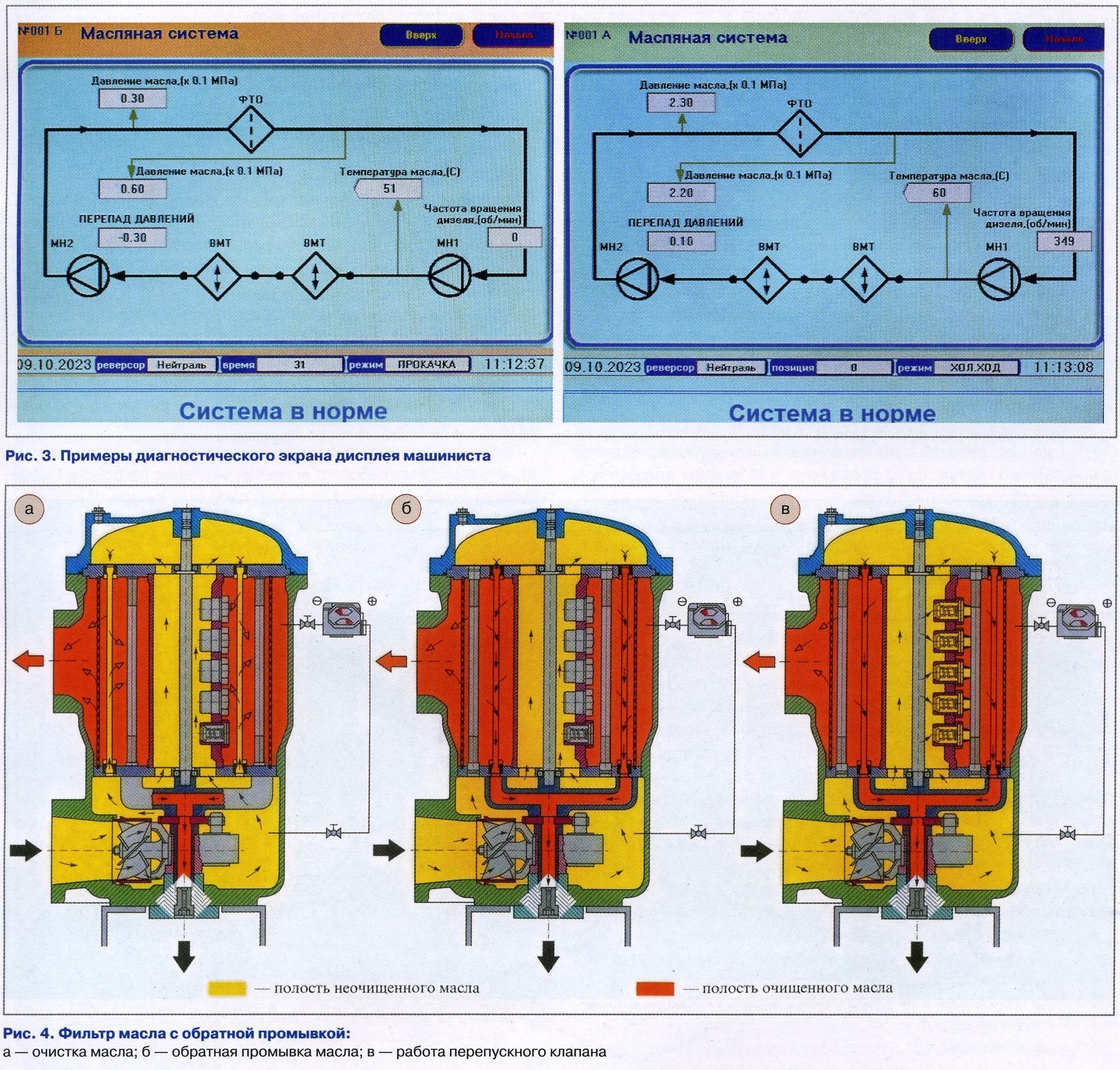 Прокачка дизеля маслом перед его пуском и после его остановки осуществляется маслопрокачивающим насосом 14 (см. рис. 1). Маслопрокачивающий насос 14 шестеренного типа, получающий привод от электродвигателя, предназначен для заполнения системы маслом под давлением не менее 0,3 кгс/см2 перед пуском дизеля и после его остановки. ![]() После пуска дизеля маслопрокачивающий насос автоматически отключается. Далее работают основные масляные насосы 5 и 12, приводимые непосредственно от коленчатого вала дизеля, обеспечивая циркуляцию масла всей системы дизеля. Частота вращения валов масляного насоса 5 при максимальной частоте вращения коленчатого вала дизеля 1000 об/мин составляет 1500 об/мин, а масляного насоса 12 — 1552 об/мин. Для контроля за работой масляной системы установлены датчики температуры и датчик давления. Работа системы контролируется по показаниям приборов на соответствующих диагностических экранах дисплея машиниста (рис. 3). При работающем дизеле масляный насос 5 забирает масло из картера дизеля через заборное устройство. Далее масло нагнетается к терморегулятору 6, который отрегулирован на заданную температуру фиксированной настройки +65 °C. При холодном масле терморегулятор перепускает масло по трубе, минуя охладители, на автоматический фильтр масла. Если температура масла не достигла фиксированной настройки +65 °C, то масло будет циркулировать, минуя водомасляные охладители, т.е. непосредственно поступать на всасывание масляного насоса 12. Далее часть масла по отдельному трубопроводу отводится к центробежному фильтру 8. Основной поток масла проходит через самоочищающийся фильтр тонкой очистки 10, где очищенное масло поступает к рабочим механизмам дизеля. Перепад давления масла до и после самоочищающегося фильтра на входе в дизель должен быть не более 1,8 кгс/см2. Принцип работы фильтра с обратной промывкой показан на рис. 4. Центробежный фильтр 8 предназначен для тонкой очистки масла, циркулирующего в системе смазки дизеля. Очищенное масло стекает через окна кронштейна в масляную ванну дизеля. В корпусе центробежного фильтра встроен регулировочный клапан, который предназначен для автоматического отключения фильтра во время работы дизеля, если давление масла в системе становится ниже 2,5 кгс/см2. ![]() Для контроля вращения ротора в верхней части колпака имеется отверстие, закрытое прозрачным корпусом маслоуказателя. Необходимый температурный режим масла в диапазоне от +70 до +80 °C обеспечивается терморегулятором, полным или частичным перепуском его мимо водомасляных теплообменников. При температуре масла выше +80 °C весь его поток после дизеля поступает в водомасляные теплообменники 3 и 9. Основное назначение терморегулятора 6 прямого действия — автоматическое регулирование температуры масла. Регулировка терморегулятора выполняется на заводе-изготовителе, и при нормальной работе дополнительная его настройка не требуется. Принцип работы терморегулятора основан на перемещении заслонки термосистемы в зависимости от изменения объема заполнителя термочувствительного элемента (датчик температуры) пропорционально регулируемой температуре (рис. 5). Исходное положение заслонки 6 термосистемы — «Закрыто». При повышении температуры масла, выходящего из дизеля, заслонка 6 термосистемы, перемещаемая термочувствительным эле