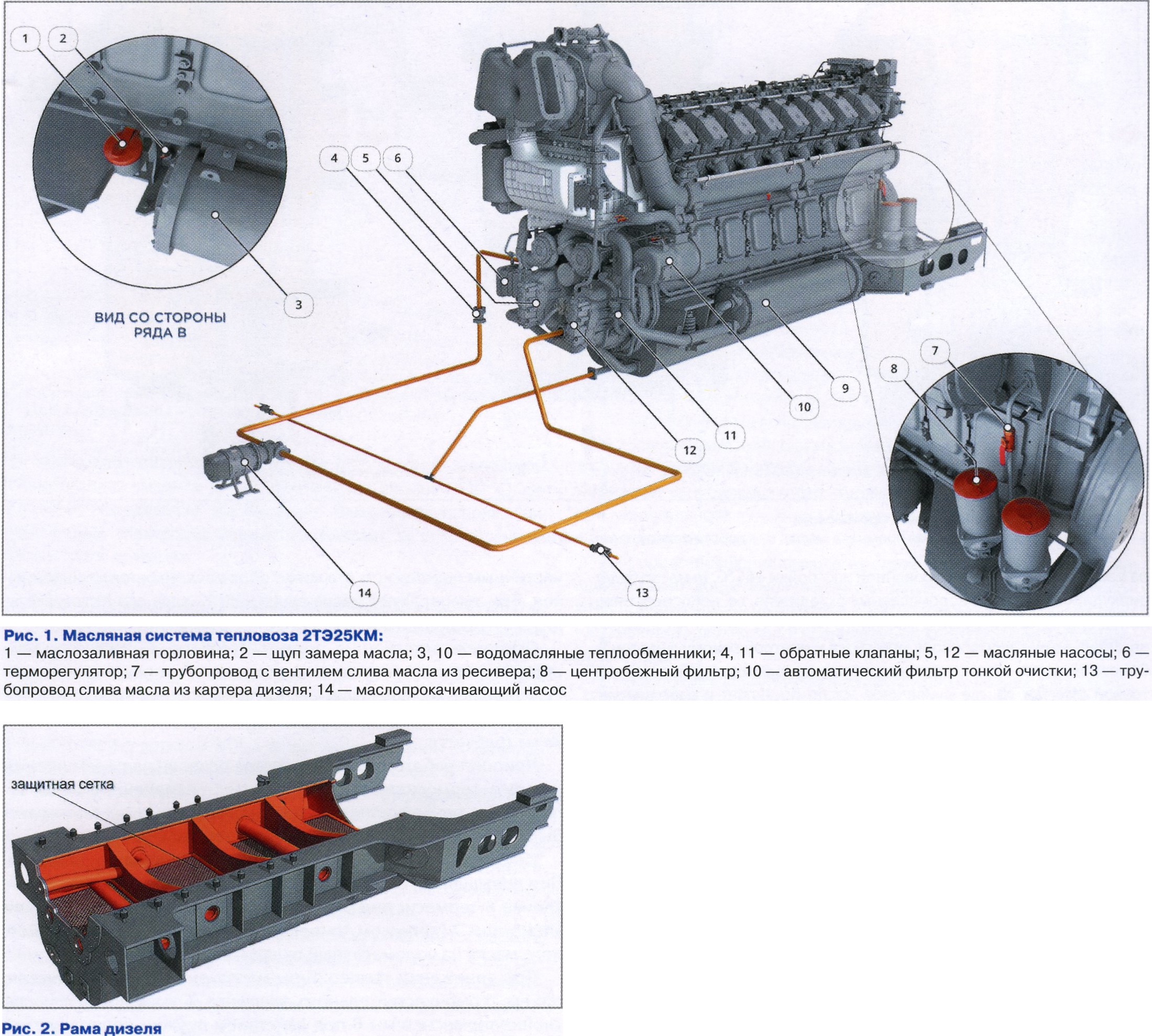 Тема: [12-2023] Масляная система тепловоза 2ТЭ25КММасляная система тепловоза 2ТЭ25КМ Г.И. ЦЫВКУНОВ, преподаватель Нижегородского подразделения Горьковского учебного центра профессиональных квалификаций Рисунки ООО НТЦ «3DFAB», г. Санкт-Петербург Масляная система тепловоза предназначена для подачи масла к трущимся поверхностям деталей дизеля и обеспечения отвода тепла от теплонапряженных поверхностей дизеля. Дизель 18-9ДГ-02 магистрального грузового тепловоза 2ТЭ25КМ оборудован двумя масляными насосами шестеренного типа с подшипниками скольжения 5,12 (рис. 1) одинаковой конструкции, двумя центробежными фильтрами 8 и самоочищающимся фильтром 10 тонкой очистки масла фирмы «Болл-Кирх». Масляные насосы включены в работу последовательно. Нижняя часть рамы дизеля образует емкость для масла (рис. 2). Сверху данная емкость закрыта пеногасящими сетками, которые одновременно препятствуют попаданию посторонних предметов в масло при обслуживании дизеля. Для заправки масляной системы дизеля типа 18-9ДГ-02 применяют моторные масла следующих марок: