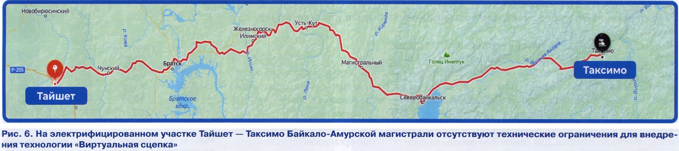 ![]() Для дальнейшего увеличения пропускной способности Восточного полигона необходимо организовать внедрение технологии «Виртуальная сцепка» на Байкало-Амурской магистрали. На текущий момент для организации движения электровозами ЗЭС5К на электрифицированном участке Тайшет — Таксимо технические ограничения отсутствуют (рис. б), а для организации работы по новой технологии на тепловозных ходах потребуется оборудовать системой ИСАВП-РТ-М тепловозы. Сейчас активно ведется разработка системы ИСАВП-РТ-М для двух типов тепловозов — ЗТЭ28 и ЗТЭ25К2М. Следующим шагом в развитии технологии видится создание виртуальных сцепок для пассажирских поездов. Чтобы решить эту задачу, необходимо выполнить следующие работы: