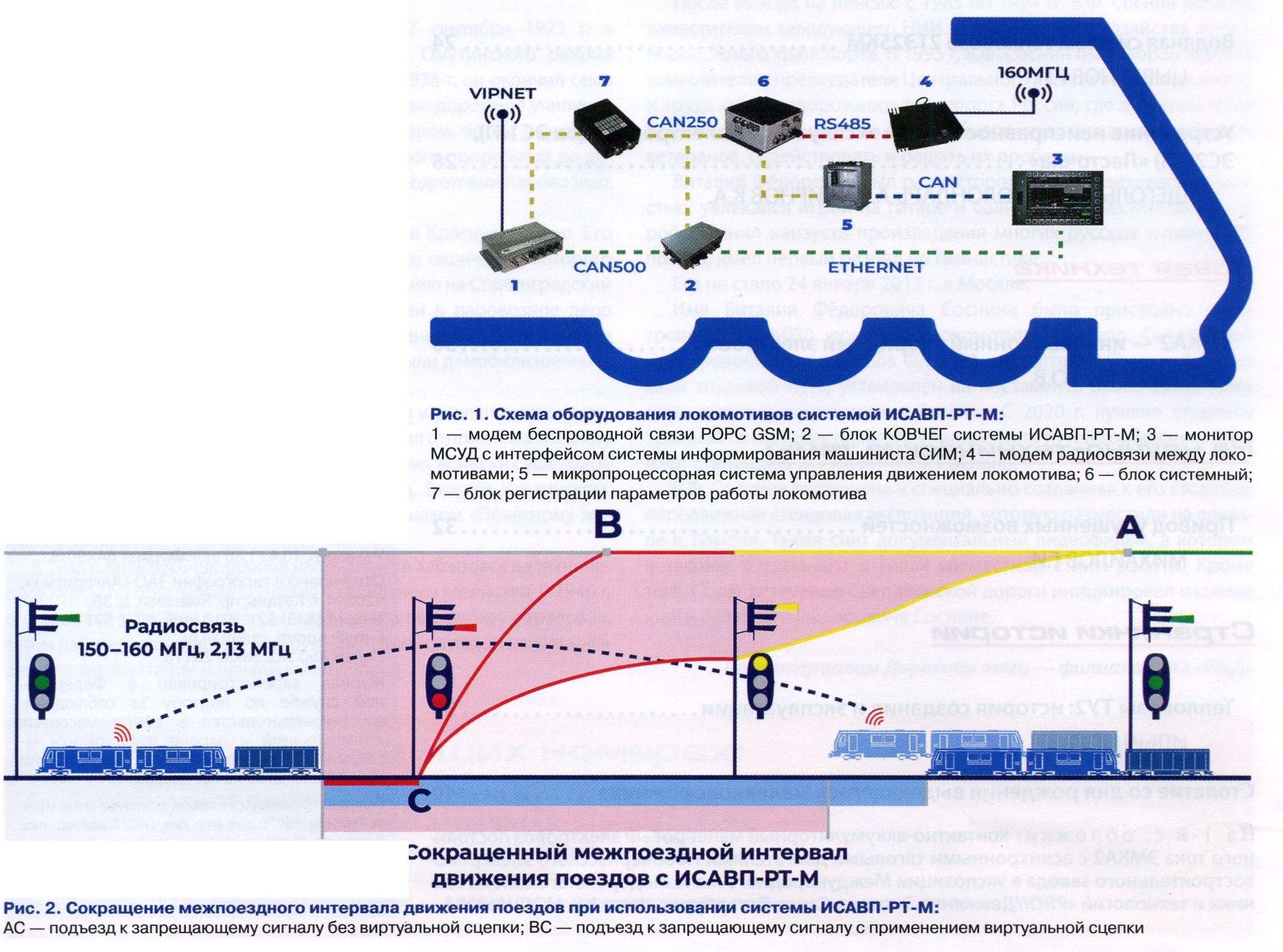 Тема: [11-2023] Перспективы развития технологии «ВИРТУАЛЬНАЯ СЦЕПКА»Перспективы развития технологии «ВИРТУАЛЬНАЯ СЦЕПКА» А.А. СУСЛОВ, заместитель генерального директора — директор департамента АВП, Д.К. РАЙДУГИН, генеральный директор, ООО «АВП Технология» В2019 г., после утверждения планов правительства по увеличению грузопотока на Восточном полигоне ОАО «РЖД», стало очевидно, что за установленные сроки невозможно реализовать это классическим методом — укладкой дополнительного пути. Одним из способов повышения провозной способности является вождение соединенных поездов с помощью системы ИСАВП-РТ (Интеллектуальная система вождения поездов с распределенной тягой). Однако у данного способа есть свои недостатки: поезда объединяются на перегоне, занимая его и, тем самым, нивелируя выигранное время. Поэтому было решено объединять поезда не физически, а виртуально. Реализовать это позволила система ИСАВП-РТ-М, с помощью которой появилась возможность осуществлять вождение поездов по технологии «Виртуальная сцепка» (рис. 1). Система ИСАВП-РТ-М является дальнейшим развитием системы ИСАВП-РТ. Благодаря новому радиомодему передачи данных М-ЛИНК и блоку-вычислителю КОВЧЕГ, стало возможным связывать поезда на расстоянии не менее 8 км и просчитывать новые алгоритмы. Система была создана компанией «АВП Технология» при активном взаимодействии со структурами РЖД — Дирекцией тяги, Департаментом технической политики, АО «НИИАС». Главной идеей технологии «Виртуальная сцепка» является подбор управления на ведомом локомотиве под поведение ведущего, чтобы сократить интервал между поездами. При вождении поездов по данной технологии устанавливается соединение по радиоканалу между локомотивами (частота основного канала связи — 160 МГц, дополнительного — 2,13 МГц), осуществляется непрерывный обмен данными (местонахождение, длина, вес, текущий и перспективный режимы работы). Система ИСАВП-РТ-М ведомого локомотива, обрабатывая информацию с ведущего, выбирает наиболее оптимальный режим работы. При этом, основываясь на получаемой информации, производится расчет момента изменения сигнала огня локомотивного светофора с «желтого» на «зеленый» или с «красно-желтого» на «желтый», что позволяет соблюдать наименьшее безопасное расстояние между ведущим и ведомым поездами без применения торможения и не нарушая скоростей движения, установленных устройствами безопасности. При движении производится учет эффективности тормозов как своего состава, так и виртуально сопряженного для расчета оптимальной траектории ведения поезда (рис. 2). Начиная с 2020 г. Восточный полигон активно насыщается грузовыми электровозами переменного тока 2(3)ЭС5К, обо рудованными системами ИСАВП-РТ-М. А с 2021 г. данной системой оборудуются все локомотивы 2(3)ЭС5К, выпускающиеся Новочеркасским электровозостроительным заводом. Модернизация локомотивов, находящихся в эксплуатации, ведется в депо. ![]() Для отработки технологии к концу 2020 г. было оборудовано 302 электровоза приписки Дальневосточной и Забайкальской дирекций тяги. Убедившись в эффективности технологии, было принято решение о ее дальнейшем тиражировании. В 2021 г. количество локомотивов было увеличено до 627. В 2022 г. полигон был расширен, и начато оснащение электровозов приписки Восточно-Сибирской и Красноярской дирекци