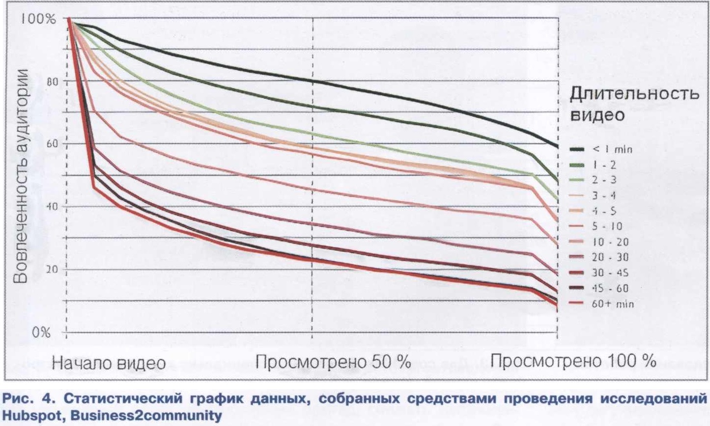 Видеоформат подачи информации настолько универсален, что дает возможность интеграции данного материала в систему образования вузов, средних технических образовательных учреждений, профессиональных технических училищ, учебных центров. Это прежде всего такие программы подготовки, как техническое обслуживание, эксплуатация тягового подвижного состава, права управления, сертификат, класс квалификации. Широкие возможности использования материалов раскрываются на тех. занятиях в региональных дирекциях, а также при самоподготовке работников. Как известно из проведенных научных исследований в области психофизиологии, человек до 90 % информации получает посредством зрения. Поэтому информация именно в видеоформате в комплексе с аудиосопровождением воспринимается максимально полно. При создании видеоролика учитываются информационные потребности аудитории: кто, где и при каких обстоятельствах просматривает видео. В нашей работе большое внимание пришлось уделить оптимизации физических параметров создаваемых материалов. Так, если необходимо удержать внимание, повысить уровень восприятия и при этом мотивировать совершать целевые действия, нужно делать достаточно короткие ролики. Принимая во внимание данные статистического графика (рис. 4), построенного на основании собранных средствами проведения исследований Hubspot, Business2community, проводящих статистический анализ социальных сетей, разработчиками был выбран оптимальный вариант продолжительности видеоролика — около трех — четырех минут. Именно данный временной предел сохраня ет достаточную вовлеченность аудитории, дает возможность сделать его максимально информативным и, как следствие, эффективным. Таким образом, был сделан важный вывод, состоящий в том, что достаточно короткий видеоролик повышает уровень восприятия информации. Главным образом, видео содержит исчерпывающую информацию. Оставаясь в рамках конкретного события, понятным для работников языком разъясняются ситуация и порядок действий. Учитывая уже имеющиеся у работников знания, в нужных случаях даются ссылки на требуемые инструкции и руководства или выдержки из них. При таком подходе к реализации появляется возможность краткости. За ключевые идеи проекта были приняты точность, понятность и краткость. Высокий уровень информативности достигается благодаря многолетнему опыту работы участников группы в должностях машиниста, машиниста-инструктора, общественного инспектора по охране труда и безопасности движения, эксперта по тяговому подвижному составу и других, а также участию в различных проектах ОАО «РЖД». Все это служит точной расстановке акцентов в конечном продукте. Знание особенностей и специфики работы изнутри дает авторам уникальную возможность указывать в видеоматериалах на важные сопутствующие детали ситуаций, которые зачастую остаются за кадром в других руководствах, так как имеют косвенное отношение к конкретной ситуации. Необходимость в высокой скорости принятия решений и точности дальнейших действий работниками ставит задачу к реализации этого проекта. Быстрое понимание обстановки и правильность действий достигаются опытным путем наблюдателя, и это дает возможность использовать данный материал при возникновении нестандартных ситуаций. Как говорится, лучше один раз увиде