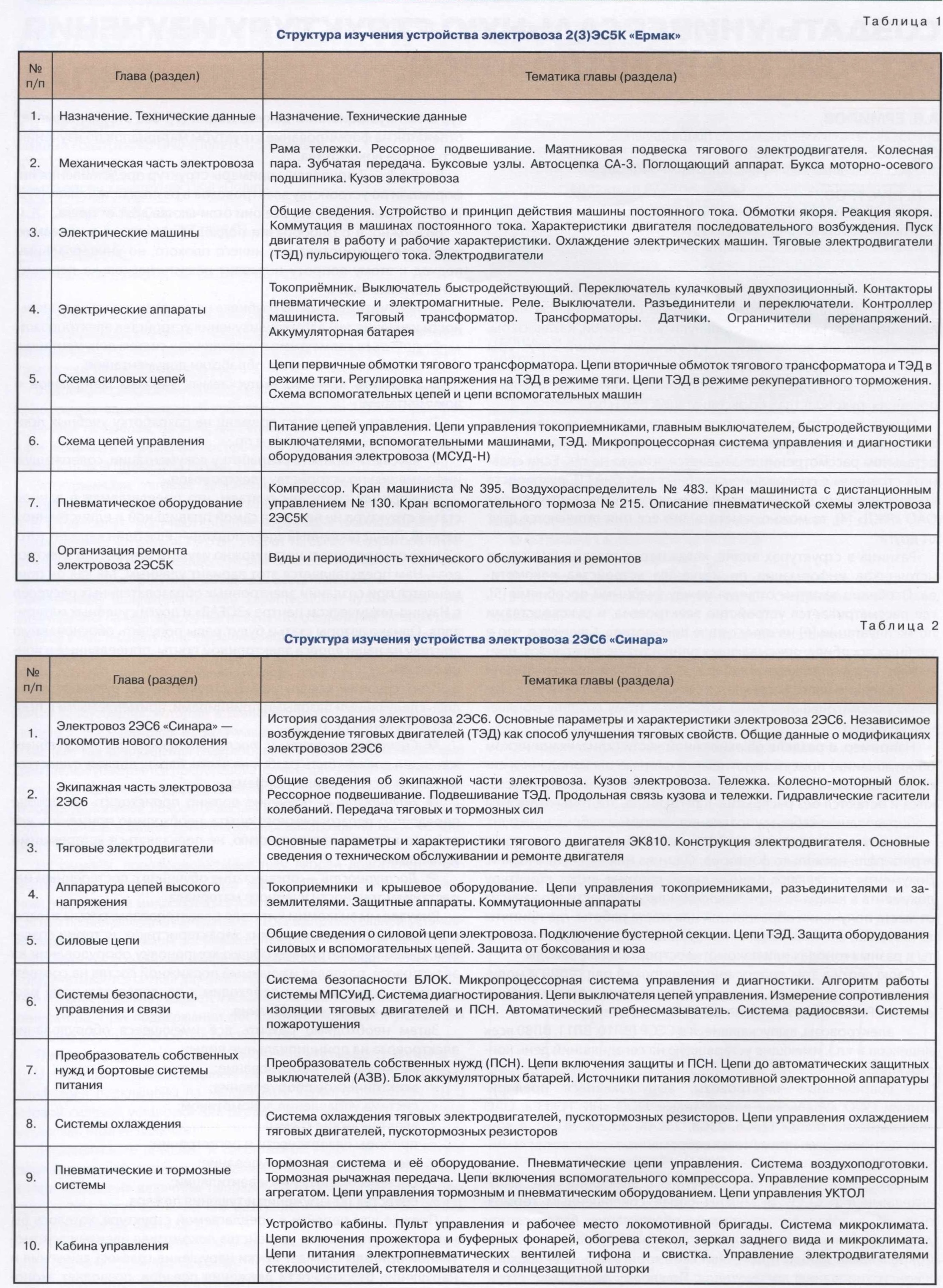 Тема: [10-2024] Создать универсальную структуру изучения устройства электровозовСоздать универсальную структуру изучения устройства электровозов А.В. ЕРМИЛОВ, преподаватель Нижнетагильского подразделения Свердловского учебного центра профессиональных квалификаций, г. Нижний Тагил, Н.В. ШУСТРОВ, методист, руководитель проектов по разработке электронных образовательных ресурсов для железнодорожного транспорта, г. Москва Авторы статьи, имея многолетний опыт работы в сфере обучения кадров для железнодорожной отрасли (в том числе локомотивного комплекса), столкнулись с неявной, казалось бы, второстепенной, проблемой — отсутствием единой структуры (набор и последовательность тем) при подаче материалов по устройству электровозов в нормативных документах, учебных пособиях, руководствах по эксплуатации (РЭ) и пр. Может показаться, что структура содержания и набор тем давно известны и везде практически одинаковые, однако при детальном рассмотрении оказывается, что это не так. Если сравнить страницы с содержанием учебных пособий [1], руководств по эксплуатации [2, 3], нормативных документов, выпускаемых ОАО «РЖД» [4], то можно заметить, что все они отличаются друг от друга. Разница в структурах видна, когда перед глазами несколько источников информации по изучению устройства локомотива. Особенно заметны отличия между учебными пособиями [5], где рассматривается устройство электровоза, и руководствами по эксплуатации [6] на одну серию локомотива. Случается, что в учебных пособиях, описывающих один и тот же электровоз, применены разные подходы в наборе и последовательности подачи тем. Довольно часто встречается ситуация, когда в больших разделах рассматриваются темы, которые к этому разделу отношения не имеют. Например, в разделе об экипажной части (или механическом оборудовании) присутствуют темы о системе пескоподачи и системе охлаждения и вентиляции. Некоторые темы часто опускаются и остаются без раскрытия. Как правило, эти темы относятся к оборудованию кабины управления, системам лубрикации и пр. Почему же так происходит? По нашему мнению, здесь могут играть роль несколько факторов. Один из них — человеческий. Документы составляют разные люди, которые видят структуру документа в каком-то определенном ключе. Отчасти это зависит от места получения образования или места работы, где приняты те или иные способы подачи материала. Например, университеты в разных городах или локомотивостроительные заводы. Свою лепту в этот вопрос вносит широкий ряд серий и модификаций электровозов, которые эксплуатируются на железных дорогах России. Все их можно разделить на две группы: > электровозы, выпускавшиеся в СССР (ВЛ 10, ВЛ 11, ВЛ80 всех индексов и т.п.), имеющие устаревшую на сегодняшний день конструкцию; > современные электровозы, выпускающиеся предприятиями ООО «Уральские локомотивы», ООО «ПК "НЭВЗ"», ОАО «Коломенский завод» (2ЭС6, 2ЭС8, 2ЭС4К, 2ЭС5К, ЭП2К), в конструкции которых применены современные технологии и микропроцессорная техника. Новые электровозы по сравнению с электровозами, выпускавшимися в СССР, оснащены более совершенным тормозным оборудованием, системами обеспечения безопасности движения, микропроцессорными системами управления и пр. Современные заводы применяют свои «оригинальные» подходы к конструированию локомотивов. По-с