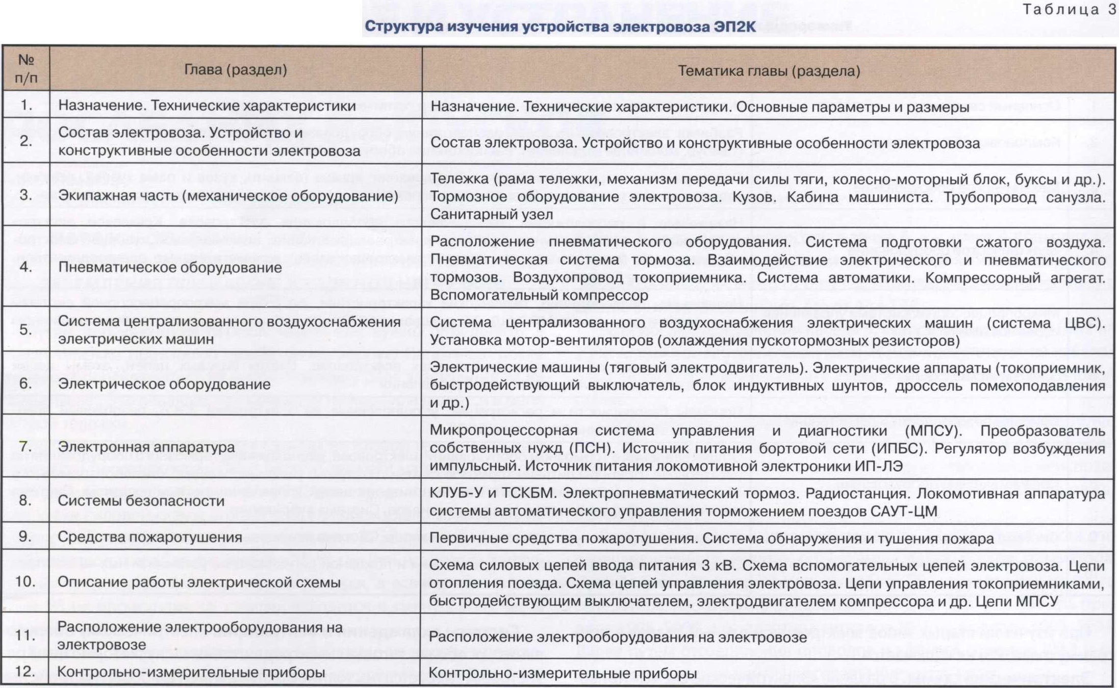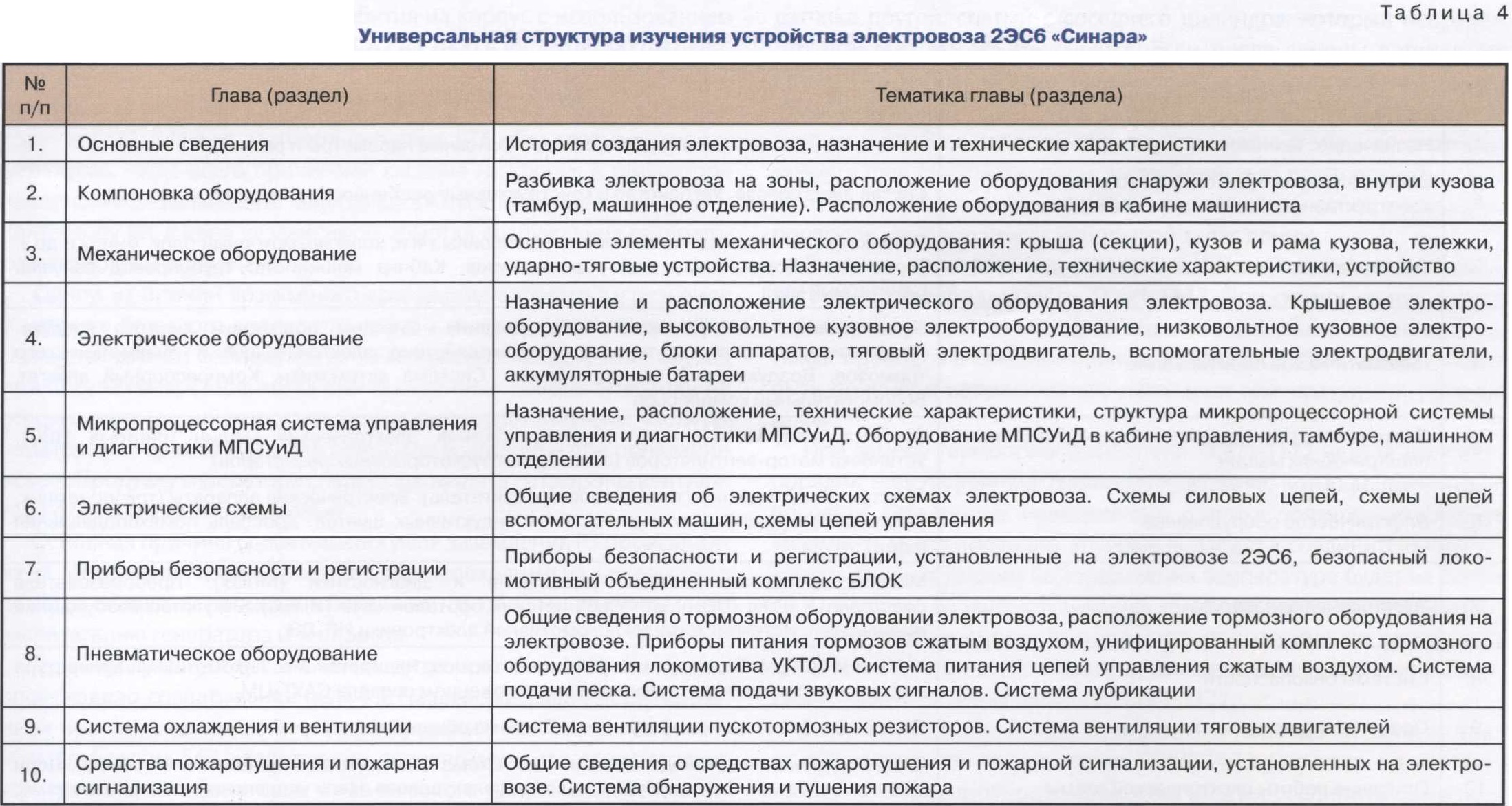 Компоновка оборудования. Далее необходимо понять, в каких частях электровоза располагается оборудование, которое в дальнейшем будет изучаться в соответствующих разделах. Для этого в разделе «Компоновка оборудования» приводятся общие сведения о размещении оборудования на электровозе, подробно рассматривается расположение оборудования на крыше, наружных частях и под кузовом электровоза, в кузове (тамбур и машинное отделение), в кабине управления. Механическое оборудование. Основу любого электровоза составляет механическая часть, которая для всех электровозов имеет аналогичные элементы: кузов, ударно-тяговые устройства, тележки, устройства связи кузова и тележек, ручной стояночный тормоз. Раздел, посвященный изучению механического оборудования, включает в себя общую информацию о механической части с последующим подробным изучением устройства всего механического оборудования электровоза. Механическое оборудование несет на себе вес электрических аппаратов, которые непосредственно участвуют в процессе управления режимами движения электровоза. Электрическое оборудование. В разделе «Электрическое оборудование» предлагается разделить электрические аппараты по группам, в зависимости от их местоположения, чтобы продолжилась логическая связь с разделом, посвященным компоновке оборудования на электровозе. В этом разделе отдельным пунктом изучаются вспомогательные электрические машины, преобразователи собственных нужд и блоки аппаратов, на которых устанавливается электрическое оборудование электровозов. Внутри соответствующих подразделов можно произвести более детальное деление оборудования (например, низковольтное и высоковольтное кузовное). Система управления. Управление электрическими аппаратами на современных электровозах (например, на грузовом электровозе 2ЭС6 «Синара») осуществляет микропроцессорная система управления и диагностики (МПСУиД) по командам с пульта управления электровоза. Поэтому далее рассматривается раздел, посвященный устройству МПСУиД, в котором описываются общие сведения об эксплуатируемой системе на электровозе, рассматриваются расположение блоков, их назначение и устройство. Возможно рассмотрение основных алгоритмов работы МПСУиД. Применяемые на электровозах микропроцессорные системы управления могут иметь различные названия (аббревиатуры): на электровозе ЭП2К — микропроцессорная система управления и диагностики (МПСУ) [7], на электровозе 2(3)ЭС5К — микропроцессорная система управления и диагностики оборудования (МСУД-Н) [8]. В тексте статьи для примера мы приводим название системы, эксплуатируемой на электровозе 2ЭС6 «Синара». При изучении старых типов электровозов данный раздел в программу (план, РЭ) не включается. Электрические схемы. В разделе «Электрические схемы» приводятся общие сведения о принципах построения электрических схем электровоза. Данный раздел изучается следующим, чтобы связать между собой предыдущие два раздела, так как будут рассматриваться вопросы, связанные с управлением МПСУиД и изменениями режимов работы оборудования электровоза. Приборы безопасности и регистрации. Системы обеспечения безопасности движения (БЛОК, КЛУБ-У, САУТ-ЦМ/485, ТСКБМ и др.) и системы регистрации (системы аудио- и видеорегистрации) рассматриваются в разделе «Приборы б
