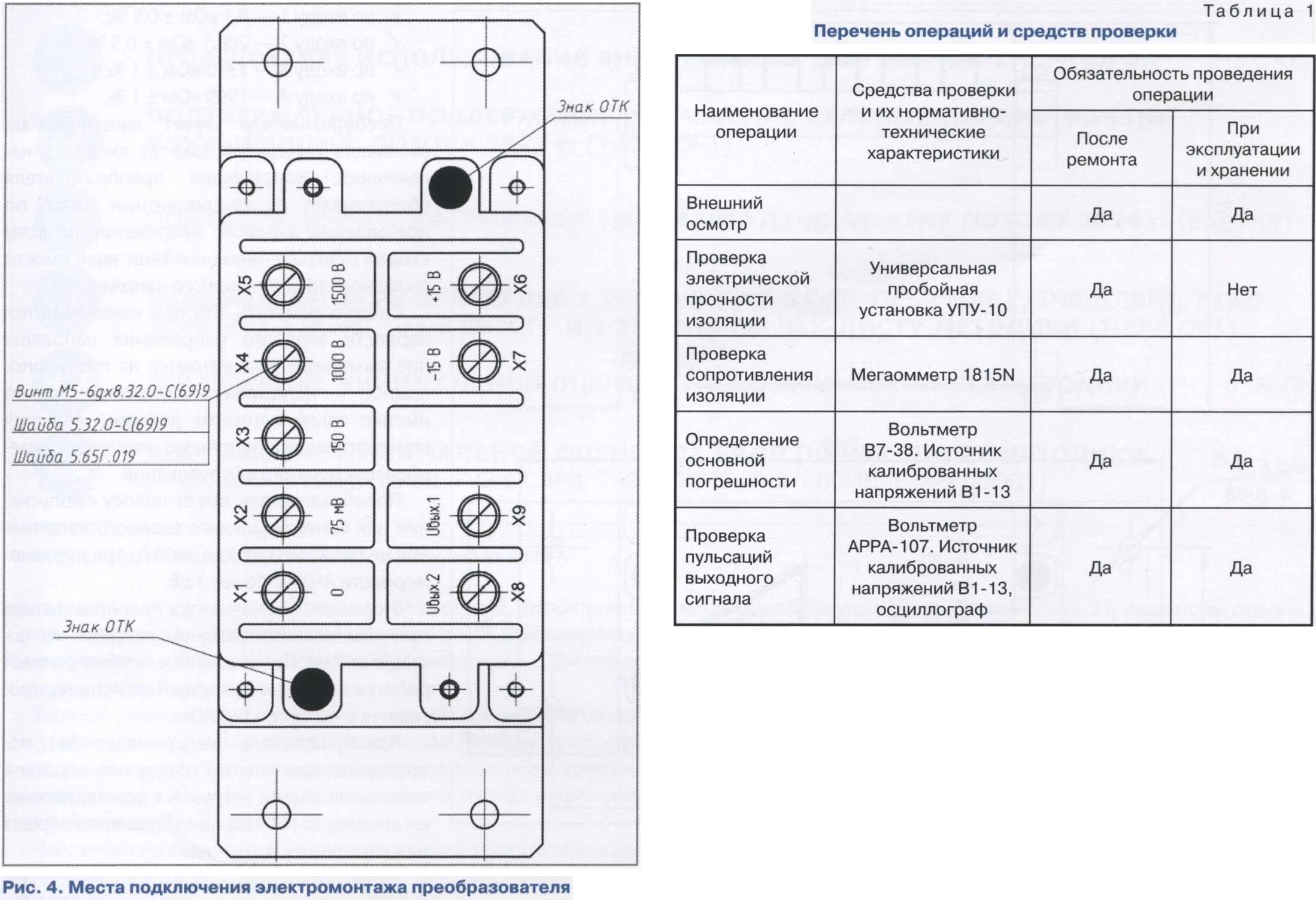 Электрическое сопротивление изоляции измерять между цепями, указанными в табл. 2, для напряжения 500 В. Электрическое сопротивление изоляции между входом и выходом должно быть не менее 100 МОм, а между выходом и цепью питания не менее 40 МОм в нормальных климатических условиях. Преобразователь с сопротивлением изоляции ниже указанного признают непригодным и дальнейшую проверку не проводят.