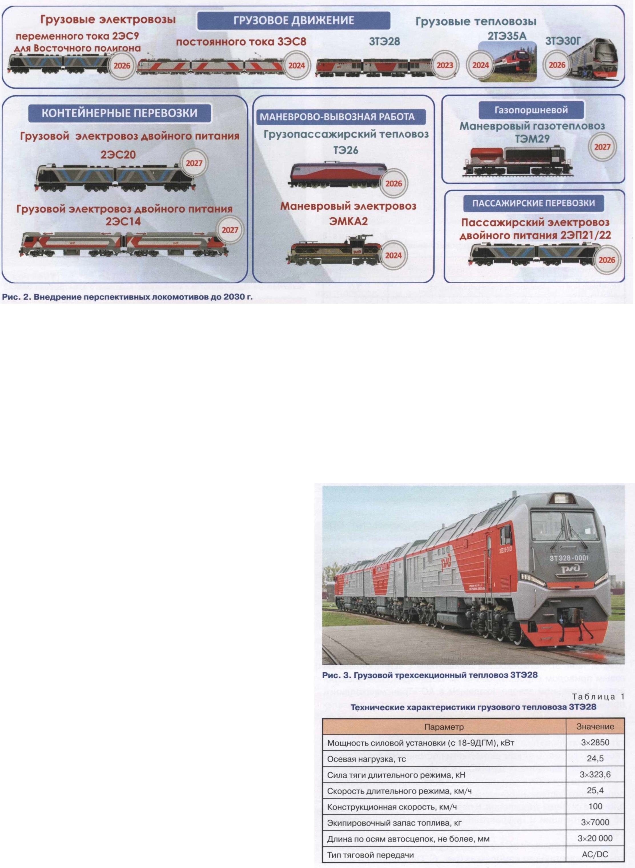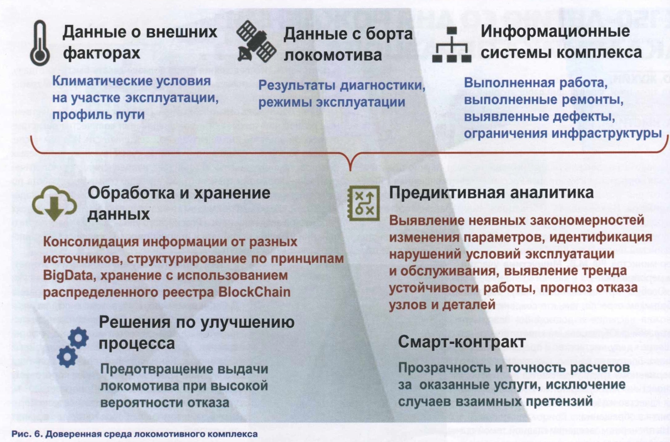 Грузовой тепловоз ЗТЭ28 Брянского машиностроительного завода (рис. 3, табл. 1). Основная цель создания новой серии трехсекционного тепловоза с асинхронным тяговым приводом заключалась в формировании локомотива из отечественного оборудования. Тепловозы ЗТЭ28-0001, 0002 успешно прошли установленный объем приемочных и сертификационных испытаний на испытательном полигоне и приняты в производство. Грузовой электровоз ЗЭС8 «Малахит» производства ООО «Уральские локомотивы» (рис. 4, табл. 2). Служит своего рода новым этапом в развитии железнодорожного машиностроения и представляет собой базовую модель для создания новой линейки электровозов в России. Производство данных двух- и трехсекционных электровозов постоянного тока напряжением 3 кВ планируется на ближайшие 15 — 20 лет. Все основные компоненты локомотива, включая асинхронный тяговый привод, силовое оборудование и интеллектуальные системы управления, разработаны и изготовлены в России. Маневровый контактно-аккумуляторный электровоз ЭМКА2 (рис. 5, табл. 3). Четырехосные локомотивы с асинхронным тяговым приводом спроектированы на Новочеркасском электровозостроительном заводе, входящем в АО «Трансмашхолдинг», предназначены для работы в депо и на пассажирских вокзалах крупных станций, где по экологическим соображениям нежелательно использование дизельных двигателей. Электровозы могут эксплуатироваться в условиях промышленных предприятий, способны работать от контактной сети постоянного тока 3 кВ или от бортового накопителя энергии. ![]() Чтобы реализовать весь потенциал инновационного тягового подвижного состава, необходимо внедрять и применять инновационные системы управления. В первую очередь здесь речь идет об автоматизации и цифровизации производственных процессов. В этом направлении в ОАО «РЖД» запущен проект «Доверенная среда Локомотивного комплекса» (рис. 6). Он направлен на создание цифровой платформы для сбора, хранения и анализа данных о функционировании локомотивов и бортовых систем диагностики. Платформа включает в себя два основных элемента: систему обработки и анализа больших данных и блокчейн-платформу для создания распределенного неизменяемого реестра записей. Основное назначение платформы — обеспечение равного доступа всем участникам локомотивного комплекса (РЖД, сервисные компании, заводы-изготовители и поставщики компонентов) к актуальным данным о состоянии локомотивного парка в реальном времени. Это позволит планировать работу и обслуживание локомотивов, а также заранее предупреждать о необходимости проведения ремонтных работ или замене необходимых деталей или узлов. Проект позволяет решать задачи по следующим направлениям: