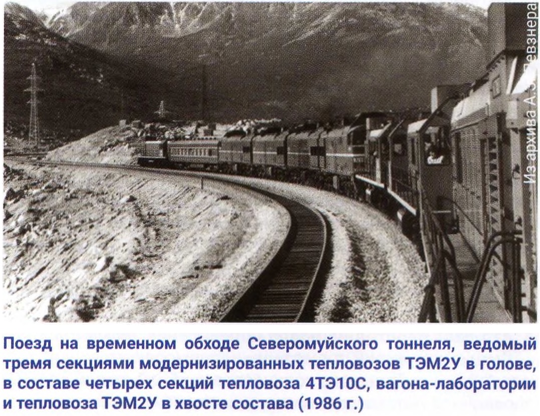 Тема: [09-2025] Тепловозы ТЭМ2У с реостатным тормозом для работы на временном обходе Северомуйского тоннеляТепловозы ТЭМ2У с реостатным тормозом для работы на временном обходе Северомуйского тоннеля А.С. КУЛАБУХОВ, главный специалист Департамента локомотивного хозяйства МПС России в отставке, Почетный железнодорожник В статье рассказано о малоизвестном факте из истории строительства Байкало-Амурской магистрали (БАМ) — модернизации под нужды строительства 16 новых тепловозов ТЭМ2У в локомотивном депо Брянск I Московской дороги, куда они поступили с Брянского машиностроительного завода. Данные локомотивы были оборудованы схемой реостатного тормоза и с октября 1985 г. по ноябрь 1989 г. осуществляли грузовые перевозки по временному сорокатысячному обходу (40 %о) Северомуйского тоннеля. Применение модернизированных тепловозов ТЭМ2У с реостатным тормозом дало возможность ликвидировать «узкое место» магистрали и резко увеличить пропускную и провозную способности временного обхода для строительства Восточного участка БАМа. Северомуйский железнодорожный тоннель в Республике Бурятия Байкало-Амурской магистрали расположен на перегоне разъезд Итыкит — станция Окусикан. Тоннель был открыт 5 декабря 2003 г. и по протяженности является самым длинным железнодорожным тоннелем в России. Его длина составляет 15 343 м. Строительство тоннеля продолжалось с перерывами 26 лет, начиная с 1977 г. До открытия тоннеля и завершения строительства в ноябре 1989 г. его постоянного электрифицированного обхода протяженностью 64 км и крутизной подъемов 18 %> полновесные грузовые поезда приходилось расцеплять и перемещать через хребет по временному обходу Северомуйского тоннеля. Временный обход был сооружен за восемь месяцев (с августа 1982 г. по март 1983 г.) и имел длину 24,6 км. При строительстве временного обхода допускались уклоны до 40 %>, т.е. на длине в 1 км условной горизонтали железнодорожная линия поднималась на 40 метров (это высота 14-этажного панельного дома!). Кроме того, на линии имелось большое количество кривых малого радиуса. В силу этого через временный обход тоннеля могли следовать только грузовые поезда длиной лишь в несколько вагонов, больший вес никакой тепловоз не мог взять при такой крутизне. Однако, если на перевал поезд, состоявший из нескольких вагонов и двух тепловозов, еще мог подняться, то проблема спуска поезда с перевала поставила множество вопросов. Движение пассажирских поездов из соображений безопасности было запрещено. Через перевал людей возили на автобусах. После строительства в конце 1989 г. постоянного электрифицированного обхода протяженностью 64 км и крутизной подъемов 18 временный обход был разобран. Опыт эксплуатации временного обхода в 1983 - 1984 гг. выявил значительные трудности эксплуатации этого участка, особенно при движении грузовых поездов на сорокатысячном спуске. По условиям безопасности и ограничения по эффективности пневматических тормозов максимальная скорость поезда на спуске была ограничена 25 км/ч. Движение на спуске длиной 11 км осуществлялось следующим образом. Состав под собственным весом постепенно разгонялся до скорости 25 км/ч, после чего осуществлялось торможение до полной остановки. Далее тормоза отпускались, состав разгонялся до скорости 25 км/ч и снова осуществлялось торможение до полной остановки и т.д. 