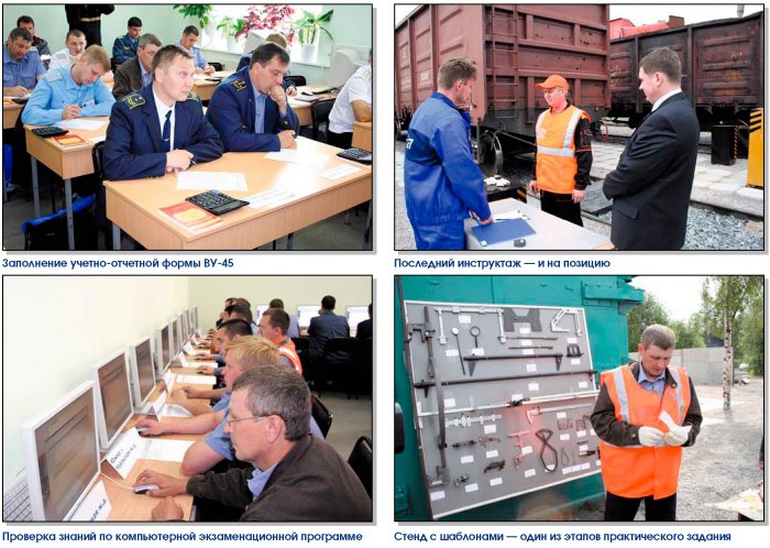 Потом начальникам ПТО необходимо было продемонстрировать уровень теоретических знаний на компьютерной экзаменационной программе. Она состояла из 391 вопроса, в том числе 71 нестандартного. Далее проверялась правильность расчетов и заполнения справки об обеспеченности поезда тормозами формы ВУ-45, дефектных ведомостей формы ВУ-22.