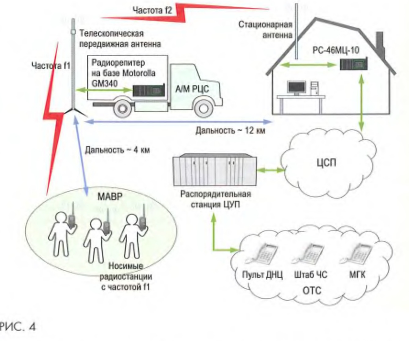 Тема: [01-2012] Связь с местом работ по радиоканалуСвязь с местом работ по радиоканалу А.В. ШЕХИН, технолог отдела эксплуатации Иркутской дирекции связи При организации связи с местом аварийно-восстановительных работ посредством подключения телефонных аппаратов систем МБ и ЦБ к жилам магистрального кабеля в некоторых случаях возможно нарушение целостности линии связи, появление наведенного напряжения от контактной сети, отсутствие необходимой мобильности связи внутри фронта работ и другие недостатки. Для полноценной связи с местом аварийно-восстановительных работ в Иркутской дирекции связи в качестве альтернативы проводной связи используется радиосвязь УКВ диапазона, а также специальное программное обеспечение для организации call-центров от компании ОКИ ТОКИ При расчете сети УКВ диапазона с помощью утилиты электронного расчета сетей ПРС было выявлено, что радиосистемы, состоящие только из носимых, стационарных или автомобильных радиостанций, не могут обеспечить требуемую дальность. Для устойчивой работы сети необходим комплекс технических средств, состоящий из носимых радиостанций, радиоретранслятора, размещаемого вблизи фронта работ, стационарной радиостанции PC-УКВ, подключенной к проводному каналу, и распорядительной станции. Кроме того, чтобы обеспечить уверенную радиосвязь между стационарной радиостанцией и приемопередатчиком ретранслятора PC-УКВ требуется достаточно высокая антенна. ![]() Расчетным путем получено (рис. 1), что на трассе 3-го типа для обеспечения уверенной радиосвязи на расстоянии не менее 12 км между ретранслятором и стационарной радиостанцией необходимы антенны высотой 12 и 15 м соответственно. При этом радиус действия радиосвязи внутри фронта работ составляет 4 км. Для проверки правильности теоретических расчетов был изготовлен и применен мобильный ретранслятор на базе радиостанций Motorola GM-340 (рис. 2), установленный в автомобиле. Принцип работы ретранслятора заключается в следующем: принимая радиосигнал на одной частоте, он усиливает его и передает на другой частоте. Таким образом ретранслятор одновременно выполняет функции и приемника, и передатчика. Абоненты, снабженные портативными радиостанциями, для работы с ретранслятором программируются в режиме полудуплекса. При нажатии тангенты радиостанция передает сигнал на частоте f1, при отжатии - осуществляет прием на частоте f2. В отличие от ретранслятора радиостанция в режиме двухчастотного симплекса ведет прием и передачу не одновременно, а последовательно. При этом частота f1 является приемной для ретранслятора и передающей для абонентской радиостанции, а f2 - передающей для ретранслятора и приемной для абонентской радиостанции. Для обеспечения достаточной дальности радиосвязи между мобильным ретранслятором и стационарной радиостанцией изготовлена удобная для перевозки и легкомонтируемая телескопическая антенная мачта, длина которой достигает 9 м в выдвинутом состоянии (рис. 3) и 1,5 м в сложенном. Для защиты эксплуатационного штата от воздействия электрического тока и наведенного напряжения мачта выполнена из диэлектрического материала. ![]() Радиосвязь с местом аварийновосстановительных работ (МАВР) организуется следующим образом (рис. 4). Внутри фронта работ используются носимые радиостанции с запрограммированными каналами на