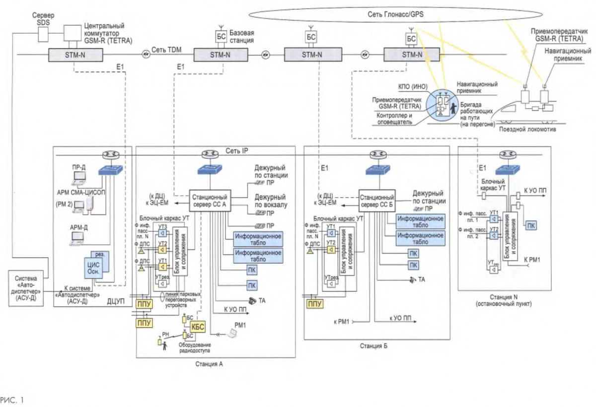 Тема: [08-2012] Централизованная система информирования и оповещенияЦентрализованная система информирования и оповещения А.Н. СЛЮНЯЕВ, главный инженер ЦСС Д.В. АНАНЬЕВ, генеральный директор «Пульсар-Телеком» B.C. АНДРИЕНКО, главный инженер проекта ГТСС И.Д. БЛИНДЕР, главный специалист НИИАС Обеспечение безопасности движения поездов, безопасности пассажиров и работников - одна из основных задач предприятий железнодорожного транспорта. Именно поэтому в 2010 г. по инициативе ЦСС и при поддержке старшего вице-президента ОАО «РЖД» В.А. Гапановича была начата разработка инновационной централизованной интегрированной системы информирования пассажиров и оповещения работающих на железнодорожных путях. Информирование пассажиров о движении поездов, оповещение их и работающих на железнодорожных путях о приближении подвижного состава, о чрезвычайных, нештатных ситуациях должно входить в комплекс обязательных мер обеспечения безопасности. Особенно актуально своевременное оповещение на участках высокоскоростного движения. До настоящего времени на российских дорогах применяется децентрализованное информирование пассажиров. Как правило, на крупных станциях (вокзалах) диктор объявляет данные расписания и сведения по их корректировке, получаемые от дежурного по станции или по вокзалу. На некоторых вокзалах организовано автоматизированное информирование на основе планового графика движения с учетом изменений, вносимых операторами. При этом данные, выдаваемые на информационных табло и в сеть громкоговорящего оповещения, не всегда содержат достаточную и актуальную информацию. На пассажирских платформах большинства станций 4-5-го класса и остановочных пунктов имеется статическое расписание поездов, об изменениях в которых извещают бумажные объявления, вывешиваемые на стенах павильонов или на ограждениях платформ. Оперативного информирования о задержках или отмене поездов на таких объектах чаще всего не бывает. Оповещение пассажиров на платформе о приближении подвижного состава производится обычно посредством информаторов с записанными речевыми сообщениями, оснащенных усилителями и громкоговорителями. При этом используются данные от устройств железнодорожной автоматики о занятии поездом соответствующего блок-участка, передаваемые каждые 10-12 с до освобождения блок-участка. Оповещение о приближении высокоскоростного поезда начинается за 10-15 мин. Причем время начала оповещения зависит только от момента занятия поездом участка приближения фиксированной длины и не зависит от скорости его движения. Такой промежуток времени от начала передачи до фактического подхода подвижного состава значительно снижает эффективность предупреждения, так как спустя 2-3 мин пассажир при отсутствии подвижного состава практически перестает учитывать поступив шую информацию. Существующие устройства оповещения не оборудованы системой дистанционного контроля исправности, в результате чего у обслуживающего персонала отсутствует оперативная информация об их отказе. Оповещение работающих на железнодорожном пути на станции осуществляется с помощью аппаратуры станционной двухсторонней парковой связи, по фидерным линиям которой передаются громкоговорящие сообщения на основании данных систем электрической или диспетчерской центра