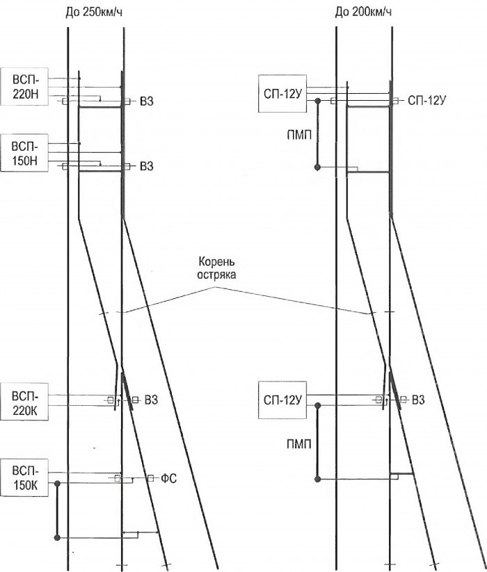 Тема: [01-2013] Перевод стрелок на высокоскоростных магистраляхПеревод стрелок на высокоскоростных магистралях С.Л. КОНДРАТЕНКО, старший научный сотрудник, канд.техн. наук На высокоскоростных участках для перевода остряков и подвижного сердечника крестовины стрелок применяют два и более электропривода, которые работают одновременно. В первую очередь эти технические средства должны обеспечивать безопасность движения поездов по стрелке, для чего требуется ограничение совместного уси лия перевода. Для плавного, стабильного перевода стрелки необходима синхронизация работы электроприводов. Решить эти задачи позволят новые отечественные электродвигатели с электронным управлением. Стрелочные переводы для высокоскоростного движения (ВСД) обеспечивают пропуск поездов со скоростью до 250 км/ч при следовании по прямому пути и 50 км/ч - на боковой. Они имеют крестовину марки 1/11, длинные гибкие остряки и подвижный сердечник крестовины с непрерывной поверхностью качения. Схемы стрелочных переводов, применяемые на участке Москва - Санкт-Петербург Октябрьской дороги при скоростном (до 200 км/ч) и высокоскоростном (до 250 км/ч) движении поездов, представлены на рисунке. На схеме приняты следующие обозначения: ВЗ - внешний замыкатель типа ВЗ-7, ФС - фиксатор (замыкатель) сердечника крестовины, СП-12У и ВСП - электроприводы, Г1МП - продольный рычажный механизм перевода. Для перемещения гибких остряков и сердечника крестовины длиной соответственно 12,5 и 10 м по подушкам стрелки по заданной эпюре требуется приложить усилие в нескольких точках по длине остряка. Для этого остряки объединяют соединительными тягами и на определенном расстоянии друг от друга устанавливают несколько электроприводов. Их количество зависит от длины остряка (для крестовины марки 1/11 - два, для 1/18 - три, для 1/22 - четыре и т.д.). Электроприводы синхронно перемещают и надежно запирают остряки в конце перевода. 'Го же происходит на подвижном сердечнике крестовины. Здесь в качестве запирающих устройств применяют внешние замыкатели, которые механически управляются электроприводами. Одна из задач, которую необходимо решить при переводе длинных остряков, - обеспечить синхронную работу электроприводов, имеющих различный ход шиберов, и одинаковое время перевода остряков. Остряк должен быть отведен: в острие (первое сечение) на 150 мм, а в конце острожки (второе сечение) - на 70 мм. Аналогичны требования и к подвижному сердечнику крестовины. ![]() На российских дорогах для синхронизации работы электроприводов стрелочных переводов ВСД применяют асинхронные электродвигатели с различной мощностью и частотой вращения вала. Работа электродвигателей происходит следующим образом. В начале перевода при подаче напряжения питания одновременно на два электродвигателя всю нагрузку принимает первый (первое сечение) за счет большей мощности и частоты вращения вала. В результате частота снижается, а момент на валу и потребляемый ток возрастают. Второй электродвигатель (второе сечение) в это время «догоняет» первый и принимает ту же нагрузку, частично забирая ее на себя. В свою очередь первый двигатель, «освободившись» отчасти нагрузки, снижает момент на валу, увеличивает частоту вращения вала, «вырывается вперед» и опять принимает всю нагрузку на себя. В таком режиме электродвигатели работают н