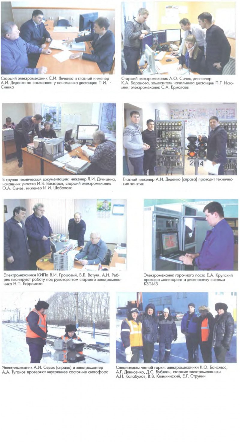Тема: [04-2013] Коллектив с высоким потенциаломКоллектив с высоким потенциалом П.И. Cиняк, начальник Тайшетской дистанции СЦБ Восточно-Сибирской дирекции инфраструктуры В прошлом году специалисты Тайшетской дистанции СЦБ Восточно-Сибирской дирекции инфраструктуры добились хороших эксплуатационных и финансово-экономических показателей. Удалось более чем на 20 % снизить количество отказов в работе устройств, вдвое сократить сбои кодов АЛСН. Предприятие дважды, в первом и третьем кварталах, лидировало в сетевом соревновании. Через станцию Тайшет проходят основные артерии сети. Здесь начинается Байкало-Амурская магистраль, в южном направлении уходит ветка на Абакан, с запада на восток тянется Транссибирская магистраль, на главном ходу которой расположен почти весь полигон Тайшетской дистанции СЦБ. Несмотря на относительно небольшую протяженность (200 км), дистанция имеет высокую оснащенность (207,1 техн. ед.). В зоне обслуживания 13 постов ЭЦ, более 600 централизованных стрелок. Практически весь участок оборудован числовой кодовой автоблокировкой, диспетчерской централизацией и диспетчерским контролем. По статистике прошлых лет большинство отказов случалось из-за недосмотра персонала во время капитального или среднего ремонта пути. Особенно часто происходили повреждения кабеля, когда на «окнах» была задействована путевая техника. Для снижения таких случаев под руководством заместителя начальника дистанции П.Г. Истомина разработали целый ряд мер. Больше внимания стали уделять подготовке к капитальному ремонту. Все строительные работы теперь под постоянным надзором СЦБистов. При длительных «окнах» в цехах организовано сменное дежурство персонала. Чтобы избежать повреждений кабеля, электроме- ханики предварительно определяют точное место прохождения трассы с помощью трассоискателя, после окончания работ обязательно проверяют исправность устройств. Кроме того, повышению надежности способствуют современные технические средства, которые внедряются на участке, - реле ИВГ-Ц, электродвигатели ДПС, MCA и др. Эффективной мерой для сокращения сбоев кодов АЛСН стало приведение всех рельсовых цепей к единой нормали (РЦ25-ЭТ50-ДСШ16-С-93). Благодаря этому из действующих схем исключили ненадежные элементы, в частности, разрядники РВНШ-250, имеющие устаревшую конструкцию. Сбои на участках с движением поездов повышенной длины и веса удалось сократить путем замены устаревших дроссель-трансформаторов ДТ-1-150 на более современные ДТ-1МГ1-300, обеспечивающие пропуск обратного тягового тока, и использования усиленных сталемедных дроссельных перемычек. Одновременно отказались от применения трансформаторов ПТ-25МП-1. Вместо них установили трансформаторы с повышенным выходным напряжением ПТ-25МП-2. В помощь электромеханикам разработана памятка, облегчающая поиск и устранение причин сбоев. На предприятии реализуются организационно-технические мероприятия, направленные на повышение безопасности движения поездов, надежности работы устройств. По инвестиционным программам на 36 сигнальных точках перегонов главного хода внедрены светодиодные светоизлучающие системы. Это позволило не только улучшить видимость светофоров, но и сократить время их обслуживания. Чтобы уберечь технические средства от атмосферных и коммутационных перенапряжений, н