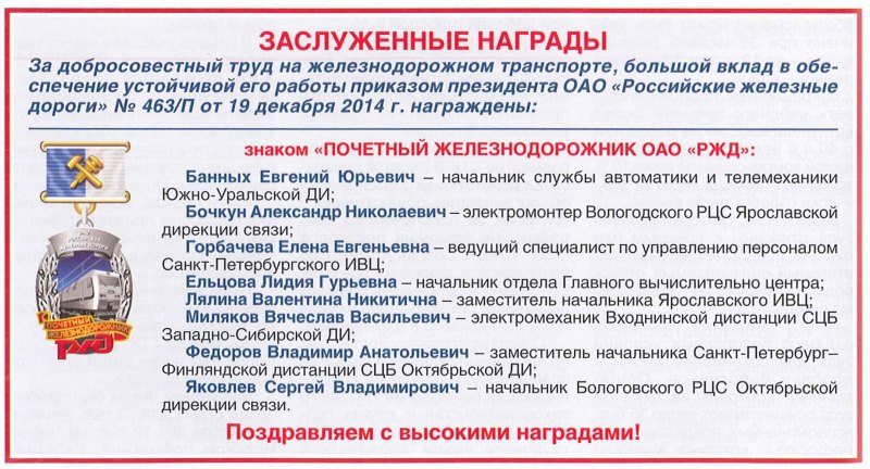 Тема: [02-2015] Главный ресурс - железнодорожникГлавный ресурс - железнодорожник Конец года - время подведения итогов проделанной работы. Перед новогодними праздниками на встрече с представителями отраслевых СМИ о результатах своей деятельности в 2014 г. рассказал председатель Российского профессионального союза железнодорожников и транспортных строителей (РОСПРОФЖЕЛ) Николай Алексеевич Никифоров Прошедший год был насыщен многими знаковыми для нашей страны событиями, которые не могли не повлиять и на социально-экономическую сферу. Так, для железнодорожников год ознаменовался работой в условиях замороженных грузовых тарифов, снижения отправления грузов и пассажирооборота. В связи с финансовыми потерями ОАО «РЖД» приходилось оптимизировать свою экономику, часто за счет сокращения объема инвестиций на ремонт подвижного состава, объектов инфраструктуры и др. Из-за падения доходов компания была вынуждена применять режим неполного рабочего времени и отпуска без сохранения содержания сотрудников ОАО «РЖД» и дочерних обществ. В связи с этим в РОСПРОФЖЕЛ отлажена система мониторинга применения работодателями антикризисных мероприятий в отношении персонала, в том числе по вопросам уменьшения расходов на персонал, сокращения штата. Что касается уровня среднемесячной заработной платы работников, то она в 2014 г. составила около 41 тыс. руб. с ростом к прошлому году 5,1 %. Однако из-за сложившегося уровня инфляции не удалось обеспечить рост реальной заработной платы. Среди хозяйствующих субъектов РФ ОАО «РЖД» находится на 14-м месте (из 61-го), субъектов промышленного производства - на восьмом, а среди хозяйствующих субъектов транспорта - на почетном третьем месте. Низкие темпы роста номинальной заработной платы и падение реальной к аналогичному периоду прошлого года отмечены у работников: локомотивных бригад в Калининградской, Московской, Северной, Северо-Кавказской, Красноярской, Восточно-Сибирской дирекциях тяги снижение реальной зарплаты составило от 7,6 до 10,3%; на техническом обслуживании и текущем ремонте грузовых вагонов в Западно-Сибирской дирекции инфраструктуры снижение достигло 8,1%; на текущем содержании пути - 4,0%; электромехаников СЦБ в Калининградской и Свердловской дирекциях инфраструктуры - 7,7%. На некоторых дорогах у монтеров пути 3-4 разрядов заработная плата составляет всего 23-24 тыс. руб. Это приводит к снижению конкурентоспособности железнодорожников на рынке труда. Соотношение к среднероссийской заработной плате упало с 1,31 до 1,28. Помимо этого, в компании пока остается нерешенной проблема увеличения размера суточных. Сегодня при нахождении работника в служебной командировке суточные составляют 100 руб. в день. Эта сумма не менялась с 2002 г. и не компенсирует командировочные расходы работников, поскольку потребительские цены за это время выросли на 300%. Профсоюз с удовлетворением воспринял недавнее решение Правительства РФ не поддерживать идею Минфина об остановке роста зарплат работникам компании. По мнению РОСПРОФЖЕЛ, это предложение Минфина носило дискриминационный характер, противоречило Трудовому кодексу и Отраслевому соглашению по организациям железнодорожного транспорта. Позиция профсоюза заключается в необходимости проведения доиндексации заработной платы за 2014 г. вместе с ее индексацией в 2015 г. н