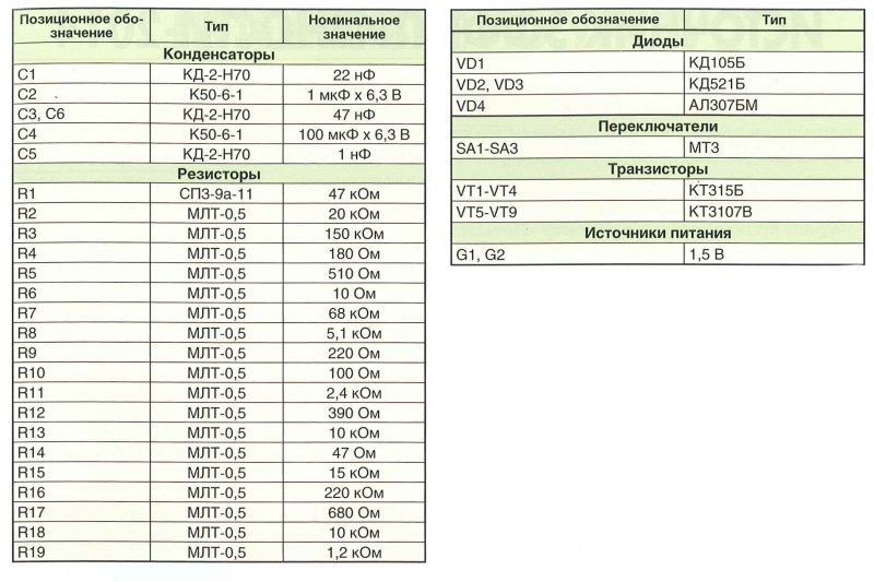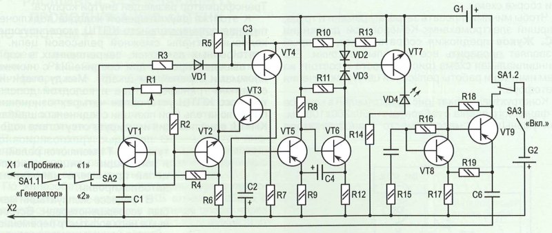 Тема: [10-2014] Универсальный пробник и устройство для зарядки различных типов аккумуляторовУниверсальный пробник и устройство для зарядки различных типов аккумуляторов Электромеханик Т.В. Федорова трудится в РТУ Тульской дистанции СЦБ Московской ДИ более 15 лет. За это время она разработала и внедрила более 30 рационализаторских предложений, направленых на повышение уровня безопасности труда, качества ремонта аппаратуры и обеспечение безопасности движения поездов. Вниманию читателей предлагаются доработанные Татьяной Вячеславовной типовые схемные решения, которые эффективно применяются на ремонтно-технологическом участке. УНИВЕРСАЛЬНЫЙ ПРОБНИК Для более эффективного поиска неисправных узлов при ремонте устройств предлагается использовать универсальный пробник. Он подходит для проверки всей электрической цепи, а также ее отдельных элементов: диодов, транзисторов, конденсаторов, резисторов. С помощью пробника можно также определить наличие постоянного и переменного напряжения от 1 до 400 В, найти фазный и нулевой провода, обрыв и короткое замыкание обмоток трансформаторов, дросселей, реле, магнитных пускателей, электродвигателей. ![]() Схема пробника представлена на рисунке, тип и номинальные значения ее элементов - в таблице. Пробник питается от двух источников постоянного напряжения по 1,5 В. В схеме используется измерительный генератор, выполненный на транзисторах VT1, VT2. Имеется также собранный на транзисторах VT5, VT6 генератор импульсов, режим работы которого зависит от напряжения смещения на базе транзистора VT5. Необходимый сдвиг фаз напряжения между эмиттером VT2 и базой VT5 создает работающий в диодном режиме транзистор VT3. ![]() В соответствии с режимом работы генератора импульсов совместно с усилителем мощности (на транзисторе VT7) светодиод VD4 находится в трех состояниях: погасшем, мигает или непрерывно горит. В схеме применен выполненный на транзисторе VT4 усилитель постоянного тока, с помощью которого определяют состояние резисторов и наличие напряжения. Имеется триггерный мультивибратор с рабочей частотой около 1 кГц, собранный на транзисторах VT8, VT9. Мультивибратор используется для «звуковой прозвонки» электрических цепей. Для проверки исправности резисторов сопротивлением до 500 кОм, а также транзисторов, диодов, конденсаторов емкостью от 5 нФ до 10 мкФ и для определения фазного провода переключатель SA1 устанавливают в положение «Пробник», a SA2 - в положение «1». Выбранный для испытания элемент подключают к пробнику. Наличие переменного напряжения определяют путем подключения щупов к узлам схемы. Если светодиод загорается, узел под напряжением. При постоянном напряжении 1-400 В VD4 загорается только, если на щупе X1 присутствует «плюс» источника напряжения. Исправность диодов и транзисторов оценивают по состоянию р-n перехода. В случае обрыва VD4 в погасшем состоянии, при пробое - горит постоянно. При подключении к пробнику исправного конденсатора VD4 вспыхивает, а затем гаснет. Длительность вспышки зависит от емкости конденсатора: чем она больше, тем дольше светится светодиод. Если конденсатор пробит или имеет большую утечку светодиод горит постоянно. Фазный провод определяют с помощью двух щупов: одним (X1) касаются проверяемого провода, другой (X2) - держат в руке. Горящий светодиод свидетельствует о том, что проверяем