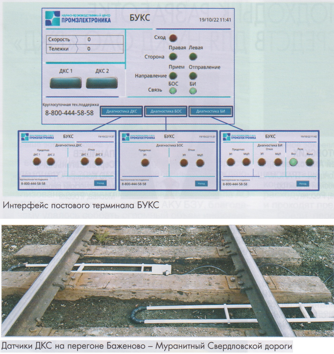 Тема: [06-2023] Принципиально новый подход к контролю схода подвижного составаПринципиально новый подход к контролю схода подвижного состава БАРАНОВ Андрей Павлович, НПЦ «Промэлектроника», ведущий инженер, г. Екатеринбург, Россия Системы железнодорожной автоматики нацелены на обеспечение безопасности движения железнодорожного транспорта и защиты транспортного комплекса. Повышение допустимой скорости движения поездов, увеличение грузооборота, а также рост требований к пропускной способности на объектах железнодорожной инфраструктуры неминуемо ведут к необходимости усовершенствования применяемых систем автоматики и телемеханики, в том числе устройств контроля схода колесной пары и фиксации факта волочения деталей подвижного состава. Работа существующих устройств контроля схода подвижного состава основана на принципе ударного воздействия. Преимуществом таких устройств является простота конструкции. Однако они подвержены разрушению от ударов наледи и камней при следовании подвижного состава, что приводит к ложному срабатыванию УКСПС. Вследствие этого возникают задержки в движении поездов, увеличиваются трудозатраты эксплуатационного персонала на восстановление работоспособности оборудования. В бесконтактном устройстве контроля схода БУКС разработки научно-производственного центра «Промэлектроника» используется иной принцип работы - индукционное взаимодействие вместо механического разрыва конструкции. Это позволяет избавиться от недостатков, присущих устройствам контактного типа. Устройство БУКС состоит из напольной части, включающей датчики контроля схода ДКС и блок обработки БОС, и постовой части. К последней относится блок интерфейсов БИ. Датчики ДКС представляют собой бесконтактные индуктивные датчики, основное предназначение которых - определение факта схода подвижного состава или наличия волочащихся деталей без непосредственного контакта с ними. Напольные датчики парно раз мещаются в балласте на глубине 80-100 мм от подошвы рельса, что исключает их разрушение от механического воздействия посторонними предметами. На полигоне научно-производственного центра были проведены испытания по определению порогов фиксации схода оси путем сбрасывания тележки с рельсов и протаскивания ее над зоной контроля схода БУКС. Блок обработки сигналов БОС получает сигналы от датчиков ДКС и принимает решение о наличии или отсутствии схода. После обнаружения схода не требуется замена датчиков ДКС и, в отличие от традиционных УКСПС, устройство БУКС автоматически переводится в рабочий режим. Бесконтактное устройство БУКС разработано для применения в диапазоне скоростей движения подвижного состава от О до 350 км/ч. БУКС позволяет определять сход колесных пар всех типов вагонов и локомотивов, направление и среднюю скорость движения состава над пунктом контроля схода, сторону состава и порядковый номер тележки, под которой обнаружен сход. Такая точная информация позволяет оперативно обнаружить место схода и принять необходимые меры. В зависимости от условий эксплуатации предусмотрены две схемы электропитания БУКС: местное электропитание напольного оборудования (при сопряжении с перегонными системами ЖАТ с децентрализованным размещением аппаратуры); центральное электропитание напольного оборудовани
