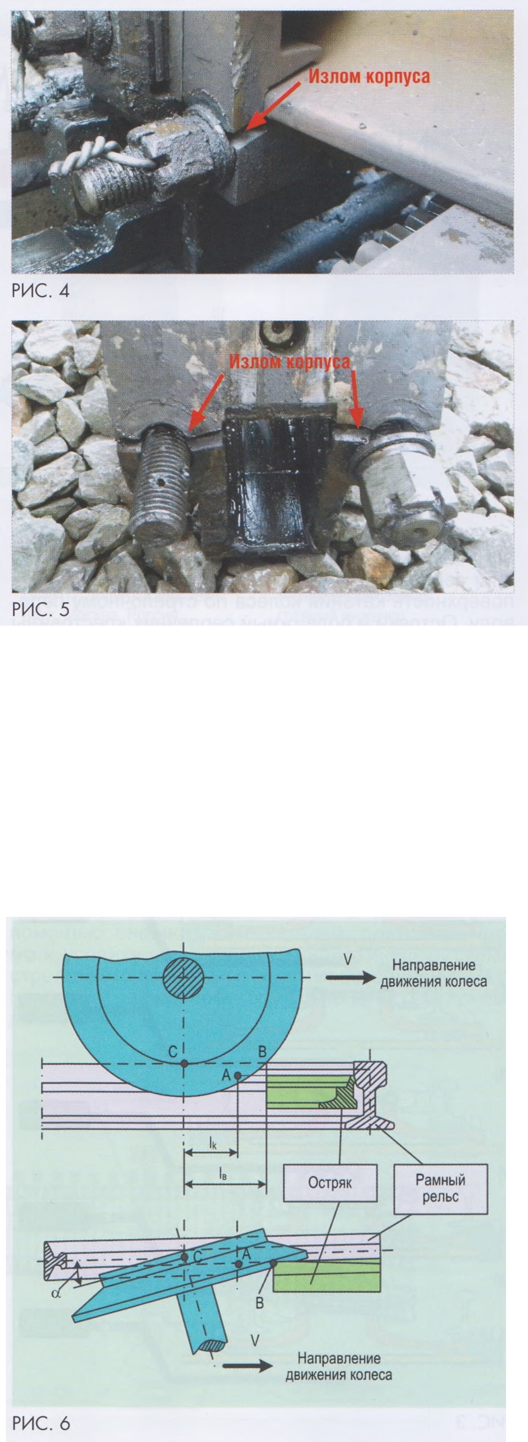Тема: [01-2023] Внешний замыкатель ВЗ-7: методы повышения надежностиВнешний замыкатель ВЗ-7: методы повышения надежности ЛОГВИНОВ Валерий Иванович, ОАО «РЖД», Проектноконструкторского бюро по инфраструктуре, заместитель начальника отделения автоматики и телемеханики, Москва, Россия МИНАКОВ Евгений Юрьевич, Российская открытая академия транспорта (МИИТ), ведущий научный сотрудник, главный инженер проекта, канд. техн, наук, Москва, Россия МИНАКОВ Денис Евгеньевич, Российская открытая академия транспорта (МИИТ), доцент, канд. техн, наук, Москва, Россия ПЕНЗЕВ Пётр Васильевич, ОАО «ЭЛТЕЗА», Армавирский электромеханический завод, главный инженер, г. Армавир, Россия Ключевые слова: стрелочный перевод с непрерывной поверхностью катания, электропривод, внешний замыкатель, кинематическая схема, колесо, остряк, рамный рельс Аннотация. Стрелочные переводы с непрерывной поверхностью катания используются на российских дорогах уже более сорока лет. В условиях эксплуатации стало понятно, что требуется модернизация их конструкции, а также необходимы современные материалы и новые эффективные технологии изготовления. ![]() При организации движения поездов по прямому пути со скоростью свыше 140 км/ч применяют стрелочные переводы с непрерывной поверхностью катания (НПК). Их остряки замыкаются с помощью внешних замыкателей, прилегая непосредственно к рамному рельсу. Крестовина имеет подвижный сердечник (ПСК), который также замыкается с помощью внешних замыкателей, примыкая прямо к усовику крестовины. Кинематическая схема стрелочного перевода с НПК и крестовиной М1/11, предусмотренная проектом ПКТБ ЦП 2726, приведена на рис. 1. ![]() На стрелочном переводе используются крестовины СП-12К с ходом шибера 220 мм, которые помимо перевода остряков и ПСК обеспечивают работу внешних замыкателей. Такая компоновка обеспечивает движение подвижного состава по стрелочному переводу в прямом направлении со скоростью до 200 км/ч. В настоящее время на сети ОАО «РЖД» в эксплуатации находятся более 1200 стрелочных переводов с НПК. Более чем за 15-летний период эксплуатации работающие в их составе внешние замыкатели ВЗ-7 показали свою надежность. Конструкция внешнего замыкателя ВЗ-7 разработки ГТСС показана на рис. 2. На рисунке приняты следующие обозначения: 1 - рамный рельс; 2 -остряк; 3 - узел регулировки плотности прижатия остряка к рамному рельсу; 4 - ведущая планка; 5 -серьга крепления кляммеры к остряку; 6 - кляммера; 7 - струбцина; 8 - узел регулировки межострякового расстояния; 9 - межостряковая изоляция; 10, 11 -упоры; 12 - узел крепления фигурной и ведущей планок; 13 - изоляция; 14, 15 - прижимные винты; 16, 17 - ведущие планки; 18 - узел крепления упоров; 19 - межостряковая соединительная тяга; 20 - рабочая тяга; 21 - направляющая. Циклограмма работы внешнего замыкателя типа ВЗ-7 при переводе и замыкании остряков стрелочного перевода представлена на рис. 3. Принцип его действия следующий. В исходном положении (рис. 3, а) левый остряк замкнут левой кляммерой, находящейся на выступе фигурной планки. Через ведущую планку она с помощью шарнирного соединения скреплена с рабочей тягой. Правый остряк в крайнем отведенном положении удерживается межо-стряковой соединительной тягой. Правая кляммера занимает свободное положение между основанием и правой фигурной планкой. В начале движения шибера (рис. 3, б) вы