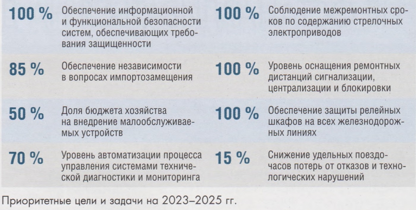 Тема: [03-2024] Не останавливаться на достигнутомНе останавливаться на достигнутом Хозяйству автоматики и телемеханики отводится важная роль в обеспечении высокого уровня безопасности движения поездов. Сегодня оно имеет трехуровневую систему управления: Управление - службы - дистанции СЦБ. Научно-техническую поддержку осуществляет Отделение железнодорожной автоматики и телемеханики проектно-конструкторского бюро инфраструктуры. В хозяйстве 179 дистанций СЦБ. Бригады СЦБ функционируют также в составе 26 дистанций инфраструктуры. Оснащенность хозяйства составляет около 34 тыс. техн. ед. Основной объем работы выполняется на железнодорожных линиях первого и второго класса. Общая численность сотрудников хозяйства из-за роста объемов внедрения увеличилась на 1225 чел. и достигла более 29,5 тыс. чел. В феврале в Санкт-Петербурге состоялось совещание, на котором были рассмотрены результаты деятельности хозяйства автоматики и телемеханики за прошлый год и определены основные направления работы на текущий год. В нем приняли участие руководители Центральной дирекции инфраструктуры, Управления и служб автоматики и телемеханики, а также разработчики и производители систем и устройств ЖАТ. С приветственным словом выступил начальник Октябрьской ДИ С.Э. Осташко. Открыл совещание заместитель главного инженера ЦДИ Г.Ф. Насонов. Он акцентировал внимание участников на том, что ключевые задачи, поставленные перед хозяйством автоматики и телемеханики, никто кроме СЦБистов решить не сможет. Он определил основную цель: обеспечить на категорированных объектах критической информационной инфраструктуры переход на отечественное ПО и доверенные программно-аппаратные средства. С основным докладом на совещании выступил и.о. начальника Управления автоматики и телемеханики П.С. Сиделев. Он отметил, что хозяйство третий год выполняет все ключевые показатели деятельности и получает отличную балловую оценку. Количество отказов технических средств всех категорий снижено на 2 %, технологические нарушения - на 22 %, общие потери поездо-часов - на 11 %. Обеспечен заданный темп роста производительности труда, причем за счет роста объема работ, а не сокращения численности. Объем доходов по ПВД выполнен на 336,1 %. В июле на сетевой школе в Челябинске были определены среднесрочные задачи на трехлетний период. Среди них выделены следующие направления: обеспечение информационной и функциональной безопасности систем, независимости в вопросах импор-тозамещения, соблюдения межремонтных сроков по содержанию стрелочных электроприводов, а также защиты релейных шкафов на всех железнодорожных линиях. Кроме этого, продолжается внедрение малообслуживаемого оборудования ЖАТ, оснащение ремонтных дистанций СЦБ и увеличение уровня автоматизации процесса управления системами технической диагностики и мониторинга. Итоги проведенной с персоналом работы по вопросам обеспечения безопасности движения, в том числе профилактической, показывают ее результативность. Допущены три события. При этом вследствие прямого вмешательства эксплуатационного штата в работу устройств событий не произошло. Полностью выполнен объем капитального ремонта. Отремонтировано 92,9 км автоматической блокировки и 117 стрелок электрической централизации, 72 КТСМ. По итогам работы ремонтных дист