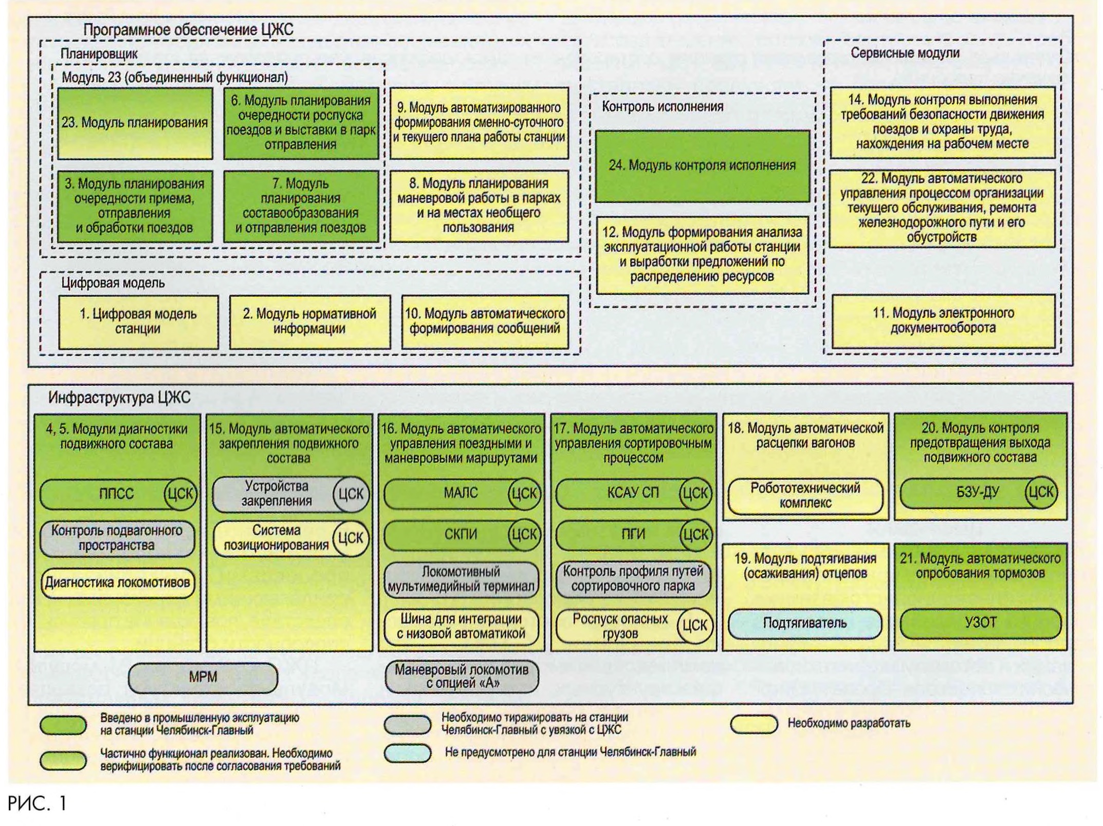 ЦИФРОВАЯ ЖЕЛЕЗНОДОРОЖНАЯ СТАНЦИЯПриоритетом Комплексной программы инновационного развития холдинга «Российские железные дороги» является задача цифро-визации и автоматизации технологических процессов. Проект «Цифровая железнодорожная станция» (ЦЖС), реализуемый в настоящий момент в компании, является составной частью комплексного научно-технического проекта «Циф ровая железная дорога», который в свою очередь является частью программы «Цифровая экономика Российской Федерации» [1]. В целевом состоянии, согласно Концепции [2], ЦЖС - это комплекс взаимосвязанных инфраструктурных, программных и технических средств, обеспечивающих выполнение нормативных значений длительности технологических операций с минимальным участием и влиянием человека. В результате реализуется гибкое управление технологическими процессами, синхронизация с прилегающими перегонами и, как следствие, повышение пропускной способности станции. ЦЖС состоит из 24 модулей. Модульная структура позволяет легко и гибко внедрять модули на различные станции, добавлять или исключать их при реализации на конкретном объекте. Модули можно разделить на инфраструктурные и программные [1-3]. В рамках плана научно-технического развития ОАО «РЖД» институтом АО «НИИАС» разработаны Методологические указания на формирование функционала системы управления ЦЖС, функциональные и технические требования на модули. Разработанные документы задают тренд на бесшовное взаимодействие программного обеспечения модуля, а также персонала, обозначая новый уровень технологического процесса. ![]() Станция Челябинск-Главный была выбрана первой для реализации ЦЖС, так как к запуску проекта уже имела значительное количество внедренных систем автоматизации технологических процессов. Общая структура модулей ЦЖС с учетом их внедрения на станции Челябинск-Главный представлена на рис. 1. Автоматические системы управления, контроля и диагностики в составе модулей ЦЖС превосходят возможности че ловека в выполнении рутинной работы. Это связано с тем, что человек, как биологический организм, подвержен влиянию внешней среды и изменениям психоэмоционального состояния [4]. Компьютер выполняет заложенный алгоритм, не подвержен утомляемости и ослаблению внимания. Уже сейчас устройства технического зрения почти на 60 % превышают человеческие возможности при обнаружении препятствий [5]. Это достигается и за счет применения технического зрения с различными спектральными диапазонами. Системы автоматизированной диагностики позволяют выявлять неисправности на ходу подвижного состава на подходах к станции, что приводит к сокращению времени обработки составов в приемо-отправочных парках на 10-30 %. В проекте ЦЖС модули увязаны друг с другом и передача информации о состоянии, например вагона, от одного модуля к другому выполняется за секунды, при этом объем информации может быть значительным. ЖИЗНЕННЫЙ ЦИКЛ ЦЖСДля обеспечения функциональной безопасности модули ЦЖС в целом и отдельные системы автоматизации должны разрабатываться с учетом всего жизненного цикла (в соответствии с ГОСТ 33477-2015). Для проекта ЦЖС специалистами АО «НИИАС» разработан укрупненный жизненный цикл, представленный на рис. 2. Институту поручена разработка инфраструктурных модулей ЦЖС, как основному разработчику систем
