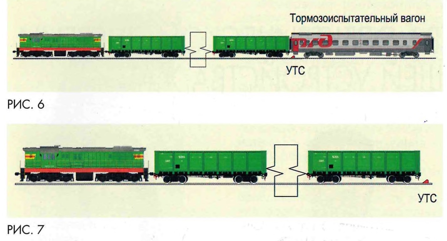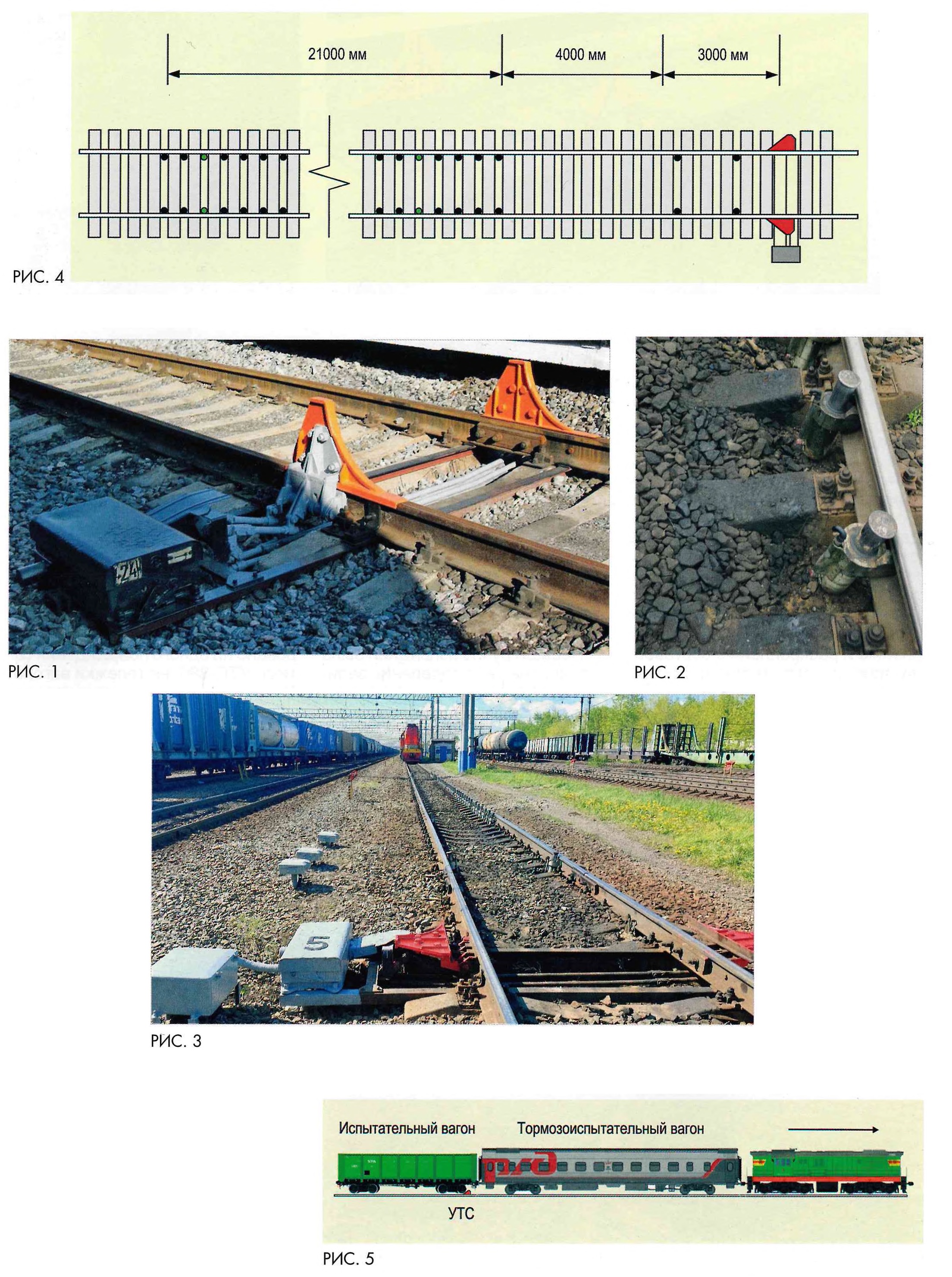 За последние 10 лет появилось несколько новых типов устройств закрепления [4]: домкратовидные устройства закрепления подвижного состава, балочные устройства закрепления, тяжелые упоры. В 2016 г. была разработана и запатентована первая система закрепления подвижного состава с использованием домкратовидных устройств. Она основывалась на импортных устройствах. В рамках импортозамещения специалисты АО «ОКБ «Электроавтоматика» им. П.А. Ефимова» разработали отечественные домкратовидные устройства закрепления составов (ДУЗС) (рис. 2). В 2021 г. данные устройства стали применяться на инфраструктуре ОАО «РЖД». Преимуществами ДУЗС являются полная автономность и энергонезависимость, высокая прочность изделия и надежная защита от воздействия внешних агрессивных факторов окружающей среды, а также использование при изготовлении отечественных материалов. Недостаток ДУЗС - это их большое количество, необходимое для закрепления подвижных единиц. Анализ специалистов АО «НИИАС» показал, что для закрепления состава весом 5 тыс. т на уклоне в 1 %о требуется порядка 150 ДУЗС, увеличение уклона и веса приводит к значительному увеличению требуемых устройств. Концепцией «Цифровая железнодорожная станция» [5] предусматривается полная автоматизация технологических операций, в том числе и операций по закреплению и раскреплению составов на приемо-отправочных путях станций. Для закрепления подвижного состава в автоматическом режиме необходимо решить следующие задачи: автоматическое позиционирование подвижного состава в зоне закрепления и автоматическое управление устройствами закрепления. Для обеспечения возможности полной автоматизации процесса закрепления подвижного состава, а также оптимизации количества устройств закрепления при безусловном соблюдении безопасности специалистами АО «НИИАС» разработана комбинированная схема закрепления подвижного состава. Принцип работы этой схемы заключается в совместном применении различных устройств закрепления, взаимодействующих с колесом подвижного состава на различных принципах. Тем самым достигается возможность компенсации недостатков применения каждого из типов устройств по отдельности при максимальной оптимизации их общего количества. Комбинированная схема закрепления подвижного состава, состоящая из домкратовидных устройств закрепления ДУЗС и упора УТС-380 в рамках разработки и испытаний Модуля № 15 ЦЖС, установлена на 5 пути парка Г станции Челябинск-Главный (рис. 3, 4). В мае текущего года на основании телеграммы ОАО «РЖД» на станции Челябинск-Главный согласно разработанной программе и методике испытаний проводились предварительные испытания комбинированной схемы закрепления с использованием тормозоиспытательного вагона и груженого состава весом 6,3 тыс. т. Первая группа испытаний была направлена на определение величины предельных значений усилий, действующих на устройства закрепления. Это было необходимо для оценки максимальной величины горизонтального воздействия на УТС-380 и вагон. Испытания проводились согласно схеме размещения, представленной на рис. 5. Вагон весом 90 т накатывался на УТС-380, далее машинист локомотива включал режим тяги и тянул вагон в сторону, противоположную закреплению. Персонал тормозоиспытательного вагона по приборам фиксировал усилие, прилож