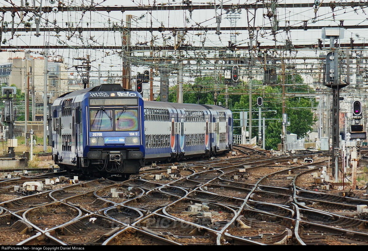 Двухэтажный ЕВС региональный поезд на конечной станции Париж Лионского после поездки из Монтеро (Южная / Est Парижа). Два устройства могут быть соединены с помощью автоматической муфты Sharfenberg, каждый одиночный может разместить 714 человек на борту (714 мест).