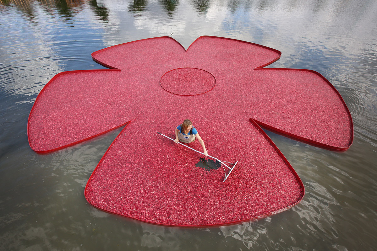 Фермер Адриана Моллор из Новой Англии (США) равномерно распределяет ягоды в плавающем сооружении в форме цветка, почти по пояс заполненном клюквой, на выставке цветов в Хэмптон-Корт — бывшей загородной резиденции английских королей, расположенной в предместье Лондона. Самая большая в мире цветочная выставка !