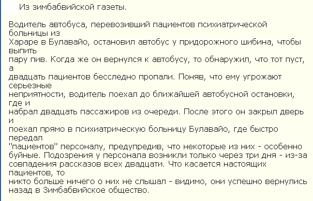Цитаты из школьных сочинений на тему СССР: «... Жила-была страна СССР. Она образовалась, когда в страну приехал Ленин. Народ сказал царю, чтоб он не правил, - и к власти пришел Ленин». (Юля Соколова) «... Люди работали, работали, работали... А о себе совсем не думали. Людям было совсем неважно, что они едят, где спят, как отдыхают». (Вадим Худяков) «Когда был союз СССР, люди не обращали внимания на одежду. Одевались не так хорошо. Мужчины одевались в галоши, в телогрейку, легкую шапку и перчатки, когда работаешь. А женщины одевали кофту, перчатки, шарф на голову (чтоб голова не была видна) - и тоже в галоши. Такая одежда была удобней всего, чтоб работать». (Вадим Худяков) «У СССР был красный флаг, поэтому в моде был красный цвет. Красный цвет обозначал кровь, которую надо пролить, когда много работаешь. Дети ходили в красных галстуках, женщины на праздники всегда одевали красные платья, машины выпускали красного цвета, в домах были красные обои». (Имя зачеркнуто.) «Все люди одевались одинаково. Существовала форма. В то время дети носили форму: девочки ходили в темно-коричневых юбках, блузках и красных галстуках, а мальчики - в темных брюках, белых рубашках и тоже красных галстуках». (Имя зачеркнуто.) «Самыми счастливыми были те, кто жил в деревнях. У них было свое хозяйство, и они всегда могли зарезать и съесть свою свинью. А в городах люди всегда голодали...» (Имя не указано.) «Продукты в СССР были не очень качественные. За колбасой были 20-километровые очереди. Колбаса одной фабрики иногда была даже зеленой. Телевизоров у людей не было». (Дарья Ракова) «В СССР управлял Ленин, который сейчас лежит в Мавзолее. Люди тогда работали на заводах и фабриках. Они делали бомбы, танки, машины, но не еду. Поэтому еды было мало. Для покупок люди пользовались талонами, а не деньгами, потому что денег у людей не было». (Юля Остроушко) «Люди в СССР всегда работали и отказывались отдыхать. Они приходили с работы и ложились сразу спать, потому что очень уставали на работе. Сны люди не смотрели». (Юля Остроушко) «В свободное время люди ходили в Мавзолей. Там люди встречались, пили чай, обменивались новостями, тусовались. В Мавзолее лежит мертвый Ленин. Советским людям очень нравилось на него смотреть». (Света Камынина) «Советским детям с ранних лет говорили, что они должны учиться и работать, а играть совсем не надо. И дети не играли, а только учились и работали. Еще все дети одевались в одинаковую одежду... Хотя в принципе, мне кажется, это хорошо... В СССР были очень забитые дети». (Юля Остроушко) «Мне жалко советских детей. У них не было компьютеров, не было игрушек. Взрослые им всегда говорили, что надо много работать. А когда надо было отдыхать, взрослые говорили им сходить погулять. Дети постоянно ходили по улицам. Это было единственное развлечение для детей». (Александра Мишахина) «Люди все делали на воздухе: читали на воздухе, гуляли... Дома, когда они не работали, им нечего было делать. И поэтому они всегда гуляли. Для людей делали парки, люди были довольны». (Имя зачеркнуто.) «Дни рождения отмечали скромно, Новый год тоже не особо... Самый главный праздник был праздник труда... А сейчас больше нигде нет такого праздника - День труда». (Юля Соколова) «В СССР жило больше всего людей (три четверти населения мира)... И все эти люди постоянно работали. СССР был самой богатой страной, хоть люди здесь 