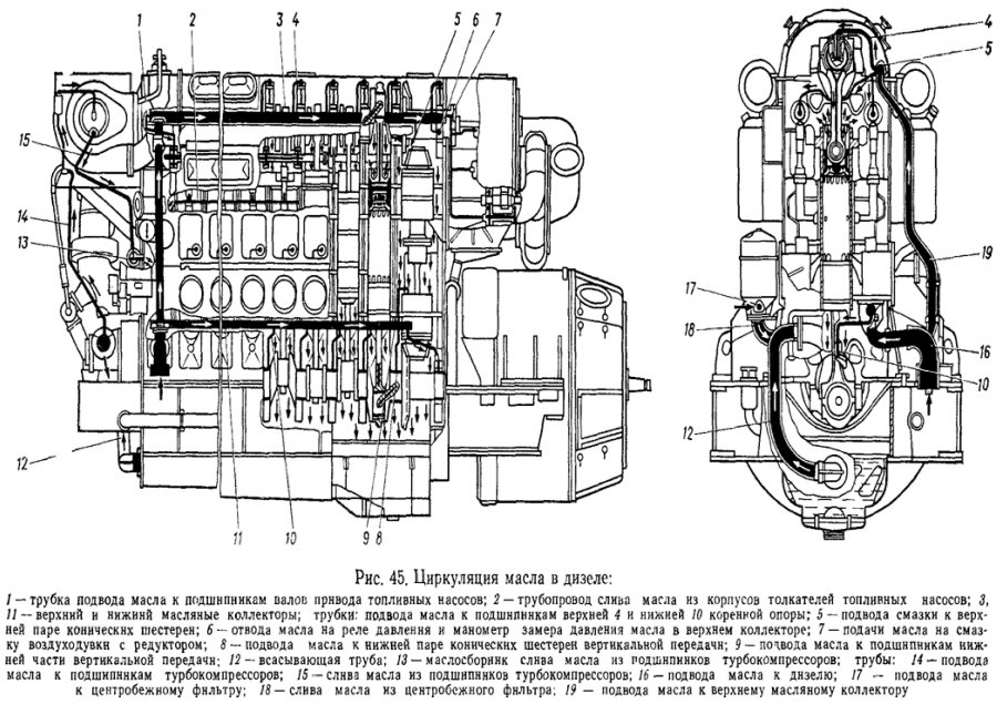 Главный контур. Насос 21 (см рис 58) забирает масло из картера и по трубопроводу подает для охлаждения в водомасляный теплообменник 51. Охлажденное масло поступает в фильтр грубой очистки 46 (см. рис. 58) щелевого типа - отфильтрованное нагнетается в масляные коллекторы дизеля.