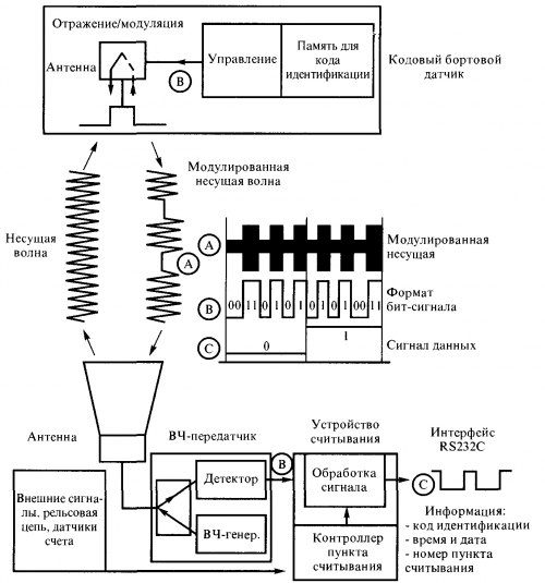 Тема: [Статья] Считывание информации с подвижного составаСчитывание информации с подвижного состава От точности и своевременности информации о перемещении подвижного состава и грузов в процессе перевозок зависит эффективность использования ресурсов железнодорожного транспорта. На железных дорогах промышленно развитых стран одним из основных средств получения информации о прибытии вагона на станцию назначения, в пункт погрузки, об отправлении со станции или поступлении с подъездных путей служат системы автоматической идентификации подвижного состава. В настоящее время корпорация Amtech занимается вопросом разработки и внедрения разночастотных средств автоматической идентификации грузовых вагонов (АVI) для железных дорог Европы. Система, получившая название Denicom, рекомендована Международным союзом железных дорог (МСЖД) в качестве единого стандарта для создания унифицированной системы автоматической идентификации. Он будет применяться по всему подвижному составу, используемому в международных перевозках и, возможно, на расчетных железных дорогах в рамках модернизированной системы АСОУП. Для нас эта система представляет определенный интерес, поэтому остановимся на некоторых принципах функционирования Denicom. В основу системы Denicom положено использование стандартных электронных маркеров, которые крепятся под кузовами вагонов и локомотивов, а также стационарных напольных считывателей, устанавливаемых в рельсовой колее. Структурная схема Denicom приведена на рис. 4.9.1. Электронный маркер представляет собой пассивный датчик, в который записывается постоянная или изменяемая информация (номер вагона, код груза, станция назначения и т.д.). При прохождении маркера над считывателем последний разночастотным импульсом включает электронные схемы датчика, которые возвращают на считыватель кодированный сигнал, содержащий информацию о вагоне или локомотиве. Информация в реальном режиме времени поступает на локальный компьютер и при необходимости далее через сеть передачи данных в центральный компьютер автоматизированной системы управления. ![]() Рис. 4.9.1. Структурная схема Denicom Считыватели обрабатывают сигналы чтения (записи), транслируют радиосигналы считывания данных с маркера и, используя разночастотную модуляцию, генерируют сигналы для записи информации в маркеры. В считывателе предусмотрены также функции по определению направления движения, счета числа осей проходящего состава (при подключении дополнительного датчика), самотестирование. В зависимости от конфигурации системы для взаимодействия с компьютером несколько рядом расположенных считывателей могут быть подключены к концентратору. Общая концепция системы отображена на рис. 4.9.2. В соответствии со стандартом МСЖД для единой европейской системы автоматической индентификации подвижного состава система Denicom имеет открытый протокол обмена, отвечающий потребностям сетевого взаимодействия. ![]() Конструктивно электронный маркер выполнен в виде прочного герметичного контейнера, благодаря чему устройство выдерживает перепады температуры от -40 до +50 °С, а также толчки и вибрации большой амплитуды. Срок службы электронного маркера составляет не менее 15 лет. Считыватель также размещен в прочном корпусе для защиты от ударов и поставляется в комплекте с универс