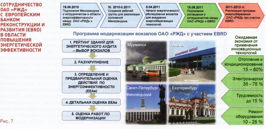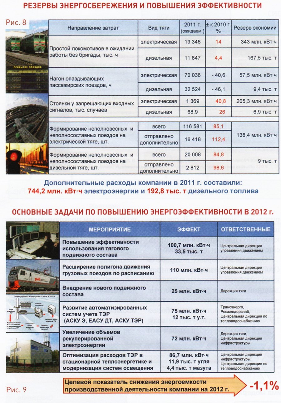 Тема: [02-2012] Повышение энергетической эффективностиПовышение энергетической эффективности В.А. ГАПАНОВИЧ, старший вице-президент ОАО «РЖД» Холдинг «РЖД» входит в число крупнейших потребителей энергоресурсов в России, на долю которого приходится 4,5% электроэнергии и 8,2% дизельного топлива. В эксплуатационных расходах удельный вес затрат на приобретение топливно-энергетических ресурсов по итогам 2011 г. составил 15,6% (рис. 1). ![]() В целях снижения себестоимости перевозок за счет повышения энергоэффективности в компании внедрена система энергоменеджмента. Она решает основные задачи Энергетической стратегии ОАО «РЖД» до 2015 г. и на перспективу до 2030 г., принятой в 2004 г. и актуализированной в 2011 г. Для реализации стратегии были разработаны программы и инвестиционные проекты, которые позволили при росте приведенной работы на 6,8% увеличить объем потребления энергоресурсов только на 0,7% и тем самым снизить энергоемкость перевозочной деятельности на 2,7%, что превышает установленный Федеральной службой по тарифам показатель. Важным инструментом энергосбережения являются системы автоматизированного контроля и учета расхода топливно-энергетических ресурсов (рис. 2). В ОАО «РЖД» реализован уникальный по своему масштабу и применяемым техническим решениям проект автоматизированной системы коммерческого учета электрической энергии (АСКУЭ). На объектах ОАО «РЖД» в едином информационном пространстве интегрированы более 250 тыс. точек учета. П рое кт консолидирует в себе современные технические решения в области электроэнергетики, единства измерений, информационных технологий. Его реализация, наряду с другими мерами, позволила почти вдвое снизить уровень технологических потерь в системе тягового электроснабжения. ![]() В 2011 г. также разработана и испытана на опытных полигонах Октябрьской и Горьковской железных дорог автоматизированная система учета дизельного топлива (ЕАСУ ДТ), обеспечивающая сквозной контроль на всех этапах — от отгрузки на нефтеперерабатывающих заводах до расхода на локомотиве через электронный маршрут машиниста, интегрированный с единой корпоративной автоматизированной системой управления финансами и ресурсами (ЕК АСУФР) (рис. 3). По результатам пилотных проектов принято решение о широком внедрении этой системы. Первый этап внедрения охватывает 32 объекта на Красноярской и Горьковской дорогах. Наработки и решения реализованы во взаимосвязи с разрабатываемой государстве иной системой «Нефтеконтроль». Продолжается перевод основных направлений движения пассажирских поездов на энергооптимальные расписания, которые рассчитываются при помощи созданного российскими учеными аппаратно-программного комплекса «Энергограф». За три года оптимизированы графики движения более 1000 пассажирских поездов, в результате чего только в 20II г. экономия электроэнергии превысила 21 млн. кВт ч. В 2011 г. планируется перевести на такие расписания весь главный ход до Владивостока, а также направление от Вологды до Воркуты. Реализация проекта невозможна без оборудования локомотивов универсальными системами автоведения (АСАВП). которых уже внедрено 2200 единиц. Сегодня все новые локомотивы оборудуются такими системами. ![]() Развернут эффективный проект по организации движения грузовых поездов по расписанию с использованием энергооп