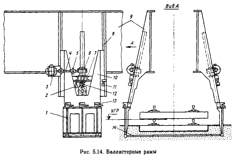 Тема: [Статья] Электробалластер ЭЛБ-1Электробалластер ЭЛБ-1 ЭЛБ-1 (рис. 5.7) предназначен для подъемки пути с рельсами не тяжелее Р65 и деревянными шпалами. Он состоит из двух ферм 2 (ферма № 1) и 21 (ферма № 2), соединенных между собой междуферменным шарниром 19. На фермах расположены все рабочие органы машины -электромагнитный подъемник 18 с механизмами 5 подъема и опускания магнитов, 7 — перекоса, 4 — сдвига пути, 6— подъема балластерных рам, 10 — подъема дозатора 16 и 8 — поворота его крыла, рельсовые 15 и шпальные 17 щетки. Хвостовая часть фермы № 2 у тележки 22 для устойчивости загружена чугунными отливками. Ферму № 2 (ферма № 1), где расположен электромагнитный подъемник, называют фермой рабочего пролета. Ферма 21 (ферма № 2) является направляющей, так как, опираясь на две тележки 20 и 22, она направляет при движении ферму 2, опирающуюся только на одну тележку 14 и на консоль фермы № 2. Питание всех электродвигателей механизмов электробалластера обеспечивает электростанция 12 переменного тока, установленная в машинном отделении 13. Там же размещен машинный преобразователь 11 для питания постоянным током электромагнитного подъемника 18. Всеми механизмами управляют с пульта 9 управления дозатором и центрального пульта 3. Электробалластер оборудован автоматическими и ручными тормозами, звуковыми сигналами, электроосвещением помещений и рабочих органов. При следовании машины бригада размещается в будке 1. В ней же хранятся инструменты и инвентарь. Междуферменный шарнир электробалластера предназначен для обеспечения вписывания его в кривые участки пути, безопасного следования по переломам профиля и участкам с изменением возвышения одной рельсовой нити по отношению к другой. Геометрическая схема соединения ферм электробалластера (рис. 5.8) обеспечивает его вписывание в кривые участки пути с сохранением положения электромагнитного подъемника по оси пути. В настоящее время электробалластеры оборудованы усиленными междуферменными шарнирами (рис. 5.9, а), у которых кронштейны сварены из двух листов, а диаметр шаровой части оси увеличен до 220 мм. Ферма № / опирается через свой кронштейн, полусферы / и 4 на шаровую часть оси 2 , которая через пяты 3 и кронштейн передает эту нагрузку на ферму № 2. Оси, полусферы и пяты унифицированы с аналогичными деталями электробалластераЭЛБ-Зм и щебнеочистительных машин ЩОМ-Д и ЩОМ-4. Междуферменные связи (рис. 5.9, 6) служат для восприятия усилий, возникающих при перемещении ферм относительно друг друга вокруг шарнира, а также для возвращения фермы № 1 в установленное среднее положение относительно фермы № 2. Они состоят из тяг /, пружин 3 и регулировочных муфт 2. Электромагнитный подъемник (рис. 5.10) -главный рабочий орган электробалластера. Он предназначен для подъема, сдвига и перекоса рельсо-шпальной решетки и удержания ее в поднятом положении во время движения машины. Для захвата рельсов он снабжен четырьмя электромагнитами, по два на каждую рельсовую нить. Грузоподъемность каждого электромагнита 75 кН. Электромагниты 1 подвешены к траверсе 5 посредством серьги 4 и валика 3. Такая подвеска дает возможность каждому электромагниту поворачиваться в вертикальной и горизонтальной плоскостях вокруг горизонтальной и вертикальной осей валика и серьги. Траверса 5 также шарнирно подвешена к поперечной балке 8 при помощи валика 6 и