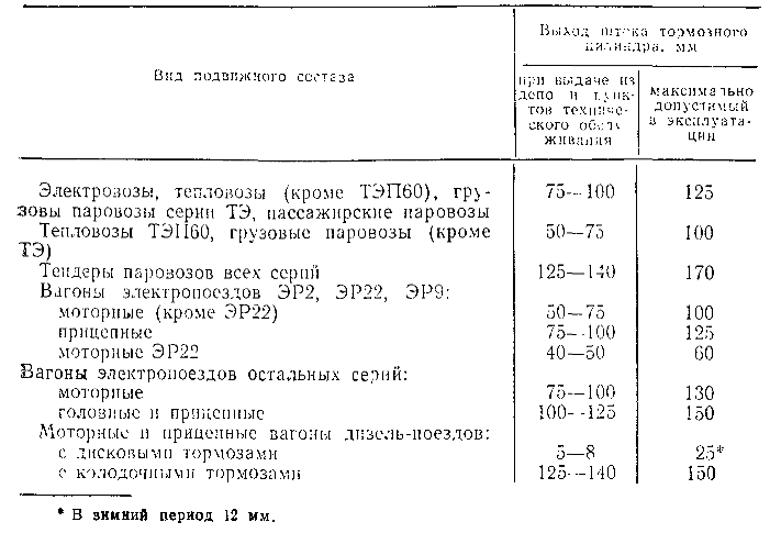 Тема: [Статья] Подготовка и приемка тормозного оборудованияПодготовка и приемка тормозного оборудования Осмотр, обслуживание и проверка тормозного оборудования при ТО-1 локомотивов и моторвагонного подвижного состава (МВПС) выполняются силами локомотивной бригады во время их приемки, эксплуатации и сдачи. При ТО-2 работники пункта технического обслуживания депо или локомотивные бригады там, где это установлено, производят осмотр тормозного оборудования и проверку его действия, устраняют выявленные или ранее отмеченные в журнале технического состояния локомотива (формы ТУ-152) неисправности. При этом до запуска дизеля тепловоза или подъема токоприемника электровоза (электропоезда) проверяют состояние крепления компрессоров и муфт привода, уровень масла в картерах компрессоров, состояние и регулировку тормозной рычажной передачи, ее предохранительных устройств и тормозных колодок, авто- и пневморегуляторов, авторежимов (на МВПС), колесных пар, действие ручного тормоза. При необходимости добавляют смазку в картеры компрессоров и смазывают золотники и зеркала кранов машиниста, а также заменяют смазку рычажной передачи и авторегуляторов тормозных колодок. После запуска дизеля тепловоза или подъема токоприемника электровоза (электропоезда) проверяют: давление в главных резервуарах при автоматическом возобновлении работы компрессоров и их отключении регулятором, производительность каждого компрессора, работу кранов машиниста и вспомогательного тормоза, действие автоматического и электропневматического тормозов, проходимость воздуха через концевые рукава и блокировочное устройство № 367М, работу сигнализатора обрыва тормозной магистрали и системы синхронизации управления автотормозами; убеждаются в отсутствии постороннего стука при работе компрессора, определяют величину утечек из уравнительного резервуара и пневматической сети. Перед выездом из депо локомотивная бригада проверяет уровень масла в картерах компрессоров; пределы изменения давления в главных резервуарах; зарядное давление в тормозной магистрали; работу кранов машиниста и воздухораспределителя при ступени торможения и ликвидации сверхзарядного давления; действие автоматического, электропневматического и ручных тормозов; проходимость воздуха через концевые рукава; состояние и регулировку тормозной рычажной передачи и ее предохранительных устройств; действие схемы электрического торможения и сигнализатора обрыва тормозной магистрали поезда (на локомотивах, оборудованных этими устройствами); определяет величину утечек из уравнительного резервуара, тормозной и питательной сети; предельное давление в тормозных цилиндрах. Кроме того, бригада спускает воду и другие примеси из главных и вспомогательных резервуаров, маслоотделителей, холодильников; убеждается, что дата проверки манометров не просрочена, ручки разобщительных кранов находятся в требуемых положениях, воздухораспределитель включен на соответствующий режим. Проверка механической части тормоза. При проверке локомотивная бригада и слесари депо обращают внимание на надежность крепления и состояние деталей рычажной передачи, предохранительных устройств, наличие шайб, шплинтов и чек. Тормозные колодки заменяют при достижении минимально допустимой толщины, при клин