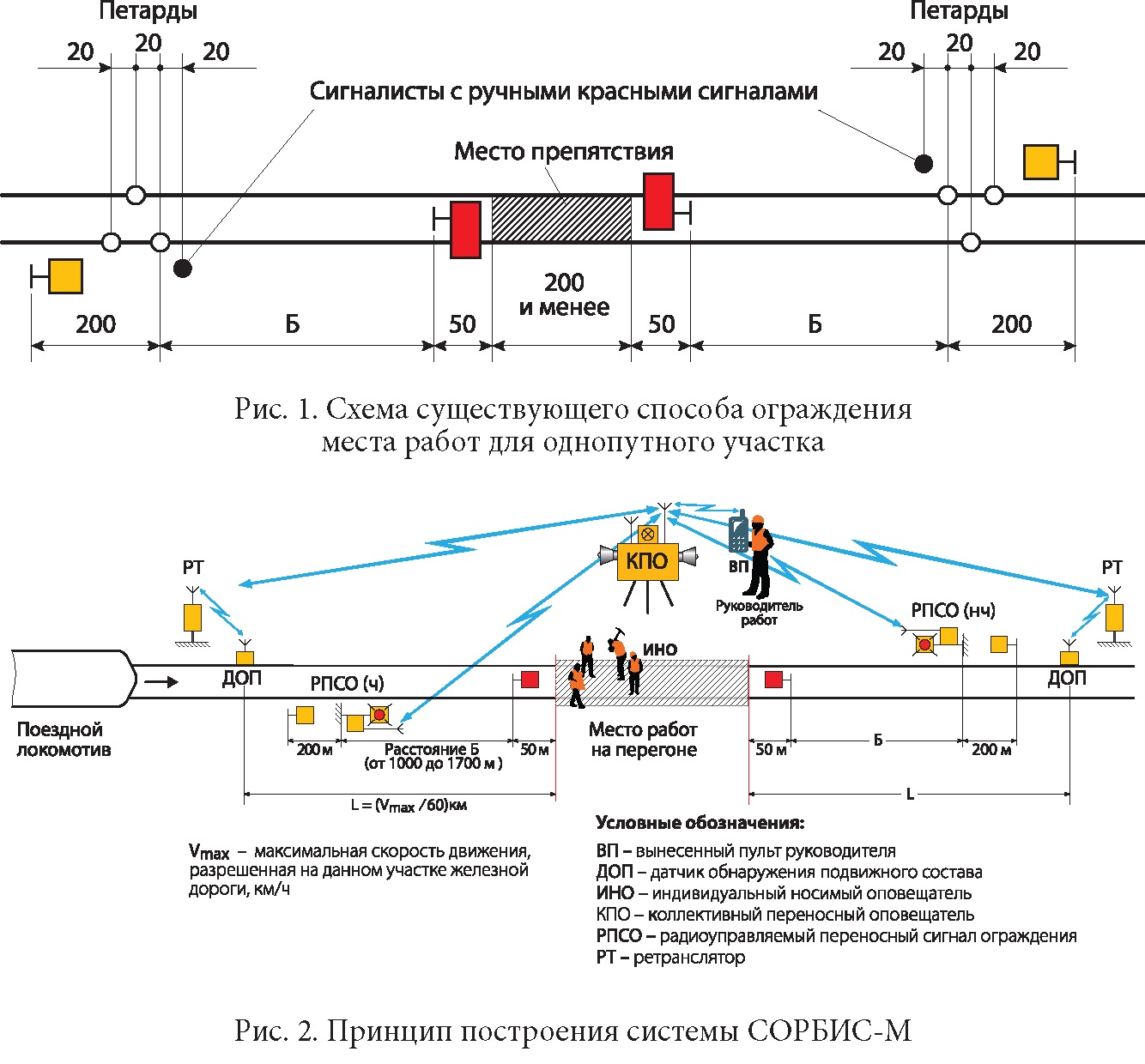 Тема: Автоматизированная система оповещения работающих на железнодорожном пути и ограждения места работАвтоматизированная система оповещения работающих на железнодорожном пути и ограждения места работ Блиндер И.Д. Захаров А.В. Михеев Л.Г. Черников А.А. Ключевые слова: автоматизированная система оповещения работников о приближении подвижного состава СОРБИС Автоматизированные системы оповещения работающих на железнодорожных путях о приближении железнодорожного подвижного состава применяются на российских и зарубежных железных дорогах только с использованием сигналистов, выполняющих, главным образом, функцию ограждения места работ, заключающуюся в предупреждении машиниста локомотива приближающегося поезда о необходимости остановки в связи с наличием препятствия для движения на месте работ. По заданию Управления пути и сооружений Центральной дирекции инфраструктуры - филиала ОАО «РЖД» АО «НИИАС» совместно с ООО «ВЗ «Электроприбор 1» в 2017-2018 годах была создана автоматизированная система, выполняющая функции оповещения о приближении подвижного состава и ограждения места работ (рис.1), используемая без участия сигналистов (СОРБИС-М). В системе СОРБИС-М (рис. 2) на железнодорожном пути в обоих направлениях на расстоянии L, км, вычисляемом по формуле: L = Vmax/ 60 (1) где Vmax — максимальная скорость движения на данном участке железной дороги, км/ч, от границ места работ устанавливаются датчики обнаружения подвижного состава (ДОП, рис.3), снабженные маломощной радиостанцией, передающей периодически через ретранслятор (РТ), установленный на расстоянии 20-50 м от ДОП, сообщения об отсутствии или об обнаружении подвижного состава на коллективный переносный оповещатель (КПО, рис. 5), расположенный на месте работ. ![]() При получении сообщений об отсутствии подвижного состава КПО воспроизводит контрольные звуковые и оптические сигналы продолжительностью приблизительно 1 с с периодом повторения 12-15 с, подтверждающие, в том числе, и о исправности системы. При обнаружении подвижного состава ДОП посылает на КПО через РТ сообщения, инициирующие воспроизведение оповещения, представляющего собой многочастотный звуковой сигнал продолжительностью 2 с, повторяющийся через 4 с не менее трех раз, сопровождаемый оптическим излучением оранжевого цвета. Перед тональным сигналом воспроизводится речевое сообщение, оповещающее работающих о направлении движения приближающегося подвижного состава. Система рассчитана на получение информации от четырех ДОП, расположенных по разные стороны от места работ на двух путях двухпутного участка. При нарушении связи с любым ДОП, на КПО идентифицируется отказавший датчик и включается звуковой сигнал аварии. При воспроизведении оповещения работающие должны отойти на безопасное место и не возобновлять работу до прохода подвижного состава. При установке ДОП на расстоянии, определенном по формуле (1), оповещение о приближении подвижного состава произойдет не менее чем за 60 с до подхода поезда к границе места работ. Датчик обнаружения подвижного состава устанавливается на шейке рельса с помощью встроенного магнита. Обнаружение подвижного состава осуществляется в результате воздействия массы колеса на колебательный контур генератора. Съем датчика возможен только с помощью специального съемника. ![]() Для ог