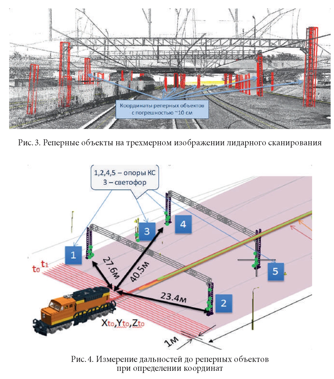 ![]() Позиционирование по реперным объектам Определение абсолютных координат ПС возможно относительно известного положения реперных объектов железнодорожной инфраструктуры, таких как опоры контактной сети, осветительные мачты, светофоры (рис. 3). Для этого необходимо по данным лидара, радиолокатора или стереокамеры решить задачу обнаружения и сопровождении таких объектов с измерением до них дальности (рис. 4). Далее, в соответствие с дальномерным методом, по избыточным измерениям, решается классическая обратная задача по вычислению координат методом наименьших квадратов или с помощью фильтра Калмана. ![]() Недостатками является: