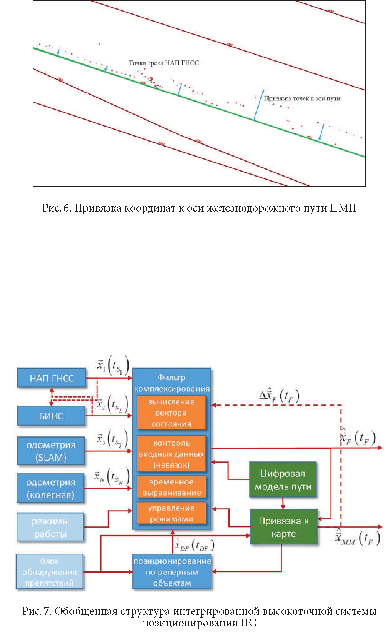 Цифровая модель путиПрименение ЦМП (рисунок 5) в составе системы высокоточного позиционирования имеет несколько аспектов. Во-первых, ЦМП является источником априорной информации о точном путевом развитии, которое описывает конечное множество траекторий движений ПС и соответственно должна использоваться для получения результирующих оценок координат и ориентации ПС по результатам наблюдения навигационных данных навигационных датчиков. Это обеспечивает повышение точности результатов оценивания и устойчивость по отношению к погрешностям и пропускам входных данных. Непосредственное использование априорной информации возможно на уровне: ![]() • комплексирования данных о направлении движения и ориентации оси пути в фильтре интегрированной системы; • ограничения оценки координат ПС в соответствии с координатами оси пути (т.е. привязка координат к оси пути - англ. Map matching, рис. 6), что в дальнейшем позволяет оценивать точность позиционирования и снизить скорость накопления погрешностей БИНС в отсутствии данных ГНСС; • управления функционированием фильтра в части используемой модели траектории движения. Во-вторых, ЦМП позволяет формировать информацию о номере пути, линейных координатах, прохождении по стрелкам, расстояний до светофоров, стрелок, платформ и т.д. В-третьих, является источником координатной информации объектов для решения задачи позиционирования относительно реперных объектов. Основным требованием к составлению ЦМП является достаточно высокая точность определения координат точек пути и объектов инфраструктуры, которая должна быть значительно выше, чем требуемая точность системы позиционирования в целом. ![]() Принципы построения интегрированной системыОбобщенная структура интегрированной высокоточной системы позиционирования ПС (бортовой части, без базовых станций ГНСС) приведена на рисунке 7. Основными особенностями, которые возникают при разработке интегрированной системы с учетом характеристик датчиков, используемых в ПС являются: