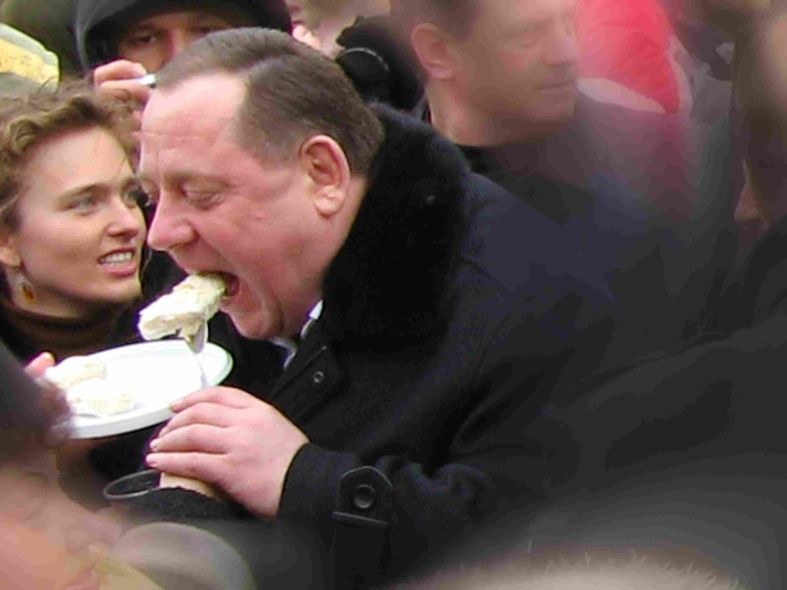 ![]() 1 апреля еще не скоро, а масленицы такой уже нет. На фото - местный князь пожирает народные блины (два года назад). Народ фотографирует блины. Всем очень весело. Прошлым летом он еще развеселял народ магией Гудини.