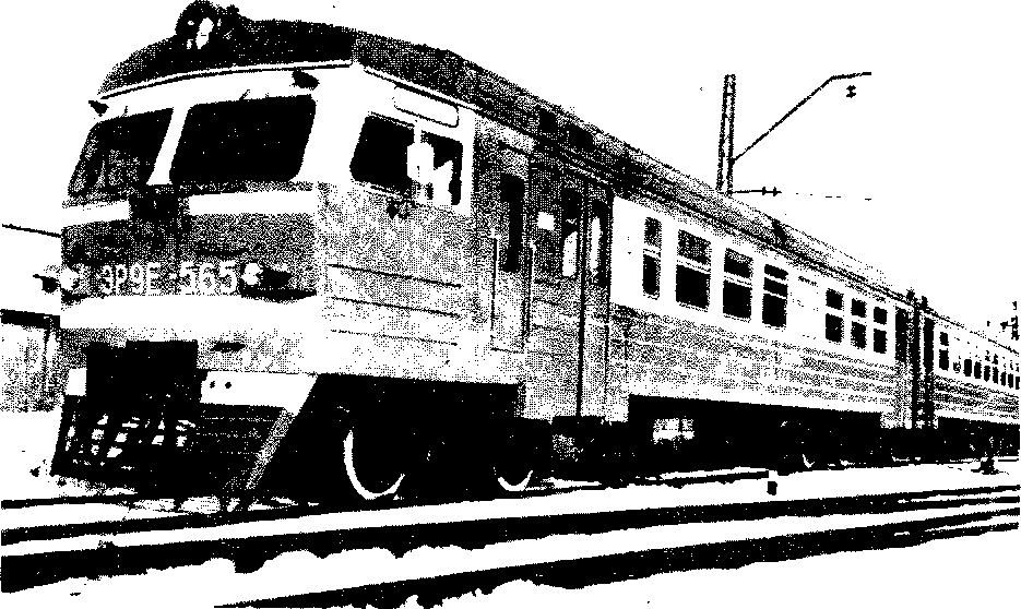 Конструкционная скорость 130 км/ч Масса тары поезда 489 т Количество мест для сидения пассажиров 1050 Общая часовая мощность на валах тяговых двигателей 3640 кВт Ускорение порожнего поезда в период пуска (до скорости 60 км,ч) на прямом горизонтальном участке п\тп 0,7 м/с2 Ускорение загруженного посіла (массой примерно в 1У т) в период пуска (до скорости 60 км/ч) на прямом горизонтальном участке пути 0,6 м/с-' Замедление поезда при торможении на прямом горизонтальном участке пути со скоростью 130 км/ч 0,8 м/с" Длина поезда нормальной составное™ 201,5 м Наименьший радиус проходимой кривой при скорости электропоезда 5 км/ч 100 м Масса тары вагона: