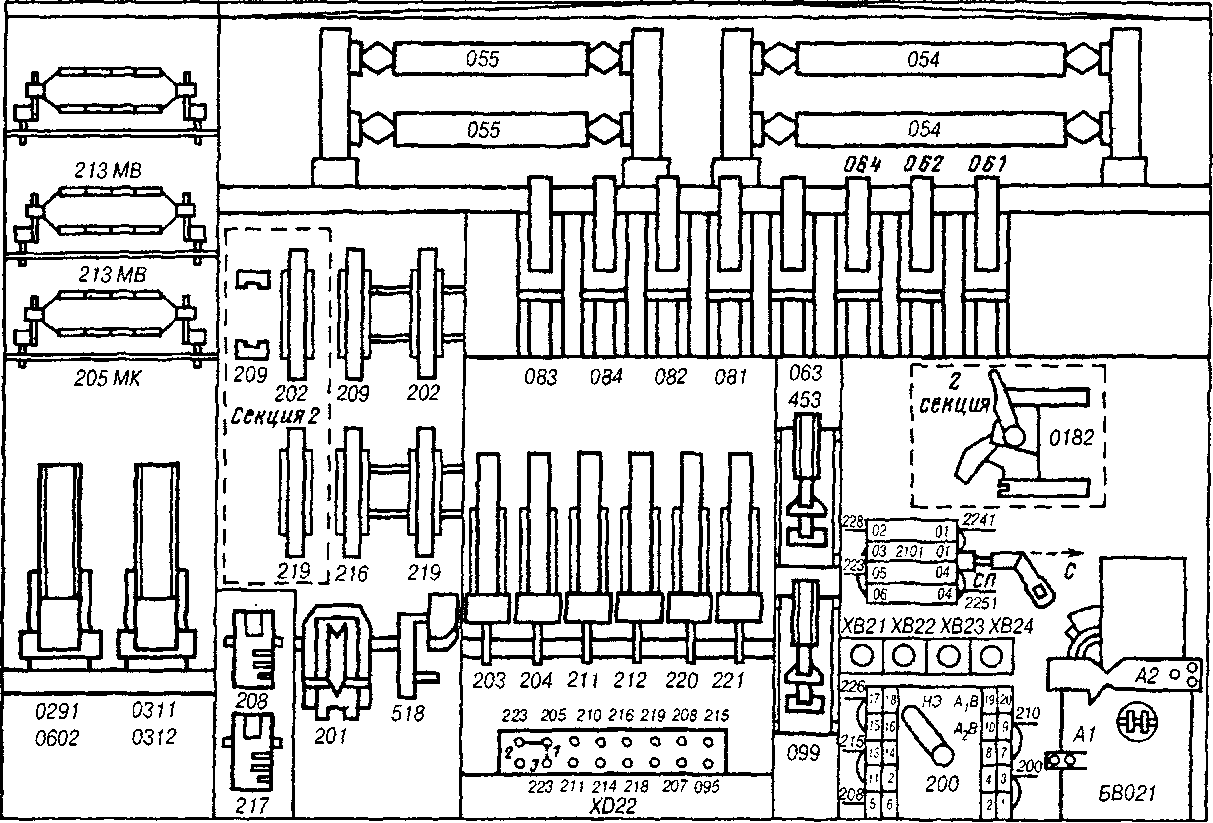 203, 204, 211, 212, 220, 221, контактор 453 двигателя кондиционера, контактор 099 подключения тиристорного возбудителя, переключатель вентиляторов 2101 (во 2-й секции в этом месте установлен переключатель 0182 "Авария БВ"), отключатсль мотор-вентиляторов 200 (на корпусе отключателя 200 установлены штепсельные соединения ХВ21