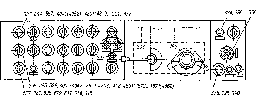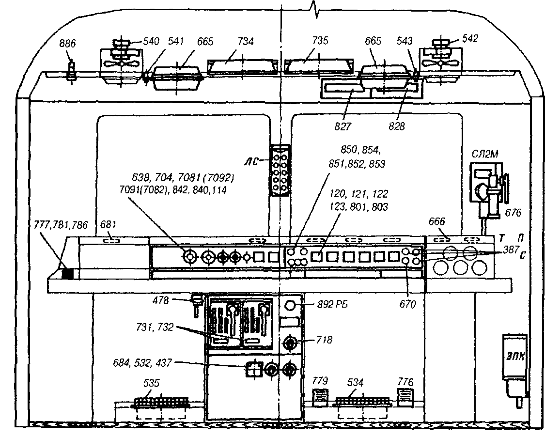 Расположение оборудования в обеих кабинах машиниста (рис. 1 и 2) одинаковое. Всю переднюю часть кабины занимает пульт управления. На средней части пульта с левой стороны расположены (см. рис. 1) кнопки подачи песка 777*, тифона 781, свистка 786 помощника машиниста. Правее от них размещаются (см. рис. 2):