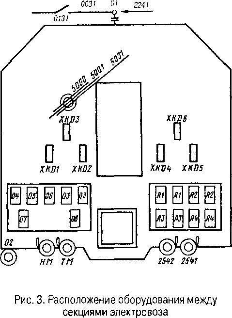 Расположение оборудования между секциями электровоза показано на рис. 3. Здесь проходят: кабели цепей управления от разъемов ХКО 1 —6 (на электровозах до № 76) или / — 8 (на электровозах с № 76); провода 5000, 5001, 5031 (последние два — только на электровозах до № 76), крепящиеся к рейке 224; кабели силовых цепей 03— 08; силовые кабели шунтов амперметров А1 —А4; силовой кабель 02 отопления поезда; рукава между концевыми кранами напорной (НМ) и тормозной (ТМ) магистралей, а также трубопроводов от кранов вспомогательного тормоза № 254 1-й и 2-й секций. На крыше машинного отделения 1-й секции около релейного шкафа находится привод межсекционного разъединителя, переключаемый выключателем, расположенным на релейном шкафу. Приводы разъединителей и заземлителей размещены под крышей машинного отделения между высоковольтной камерой и промежуточным контроллером.