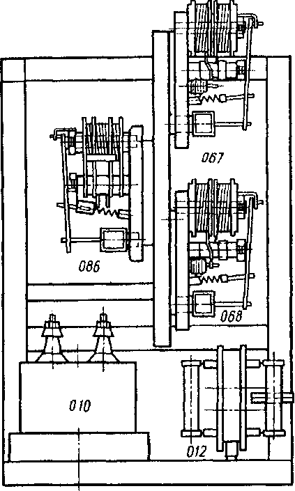для подъема на крышу электровоза через люк, имеющий блокировочную защиту. К торцовой стене справа от дверей прилегает релейный шкаф и шкаф центральной рейки зажимов (ЦКР). В релейном шкафу находятся (сверху вниз): промежуточные реле, реле времени, реле кон-такторного типа, реле "Набор", "Сброс" и шаговое (все три закрыты общим кожухом), реле замедления защиты от пониженного напряжения 808. импульсное реле сигнализации 8332. диоды, предохранитель 516 двигателя вспомогательного компрессора, АЗВ обогревателя масла в картере двигателя вспомогательного компрессора 525. В левой стороне релейного шкафа расположены штепсельные соединения ХР81 — На торцовой стене машинного отделения во второй секции на электровозах до № 76 установлен резистор 576 с разъединительными диодами. На электровозах с № 76 этот резистор размещен внизу под РЩ 500.