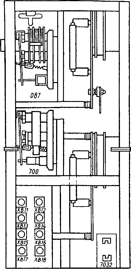 700, штепсельные соединения ХВ11 —XBI8, зажимы разъединителя 7032 (только во 2-й секции). В середине высоковольтной камеры внизу установлено реле напряжения 112 (на рис. 4 — 6 не показано).