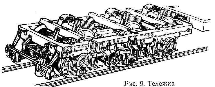 Кузов представляет собой сварную стальную конструкцию и опирается на тележки (рис. 9) четырьмя боковыми опорами, установленными над хомутами продольных листовых рессор, которые с помощью наклонных подвесок и кронштейнов подвешены к раме тележки. Рамы тележки опираются на буксы через систему цилиндрических рессор, балансиров и листовых рессор, расположенных под буксами. .