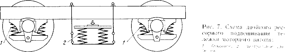 На прицепных и моторных вагонах электропоездов ЭР9М и ЭР9Е применено двойное рессорное подвешивание (рис. 7), состоящее из двух ступеней — буксового подвешивания и центрального, работающих последовательно. В отличие от электропоездов ЭР9 в конструкциях рессорного подвешивания электропоездов ЭР9М и ЭР9Е применены только цилиндрические пружины. Их изготовляют из стального прутка, который навивается на цилиндр диаметром, равным внутреннему размеру пружины. Для придания пружине необходимой упругости ее подвергают закалке. Применение цилиндрических пружин вместо листовых рессор обусловлено тем, что листовые рессоры имеют значительное внутреннее трение между листами, поэтому при движении электропоезда возникают высокочастотные колебания. Эти колебания в зависимости от частоты воспринимаются пассажирами в виде дрожания, шума или качки. Применение цилиндрических пружин, не обладающих внутренним трением, обеспечивает вагону плавный и бесшумный ход. У неподвижного вагона пружины испытывают только статическую нагрузку. При движении вагона по неровностям пути его кузов совершает вертикальное колебательное движение. При этом в некоторые моменты времени нагрузка на пружины или увеличивается или уменьшается по сравнению со статической на величину, называемую динамической нагрузкой. Наибольшая нагрузка на пружину, т. е. сумма статической и динамической нагрузок, служит для расчета пружин на прочность. По наименьшей нагрузке — разности статической и динамической нагрузок — судят о минимальном давлении колесной пары на рельс и о безопасности движения колесных пар (возможности схода с рельсов).