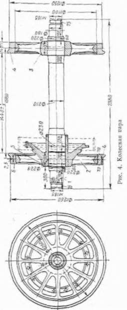 Каждая колесная пара (рис. 4) состоит из оси I, на которую насажены спицевей колесный центр 2 со специальной удлиненной ступицей и коническим диском для крепления венца зубчатого колеса и спи-цевой центр 3. На колесные центры насаживаются бандажи 4.