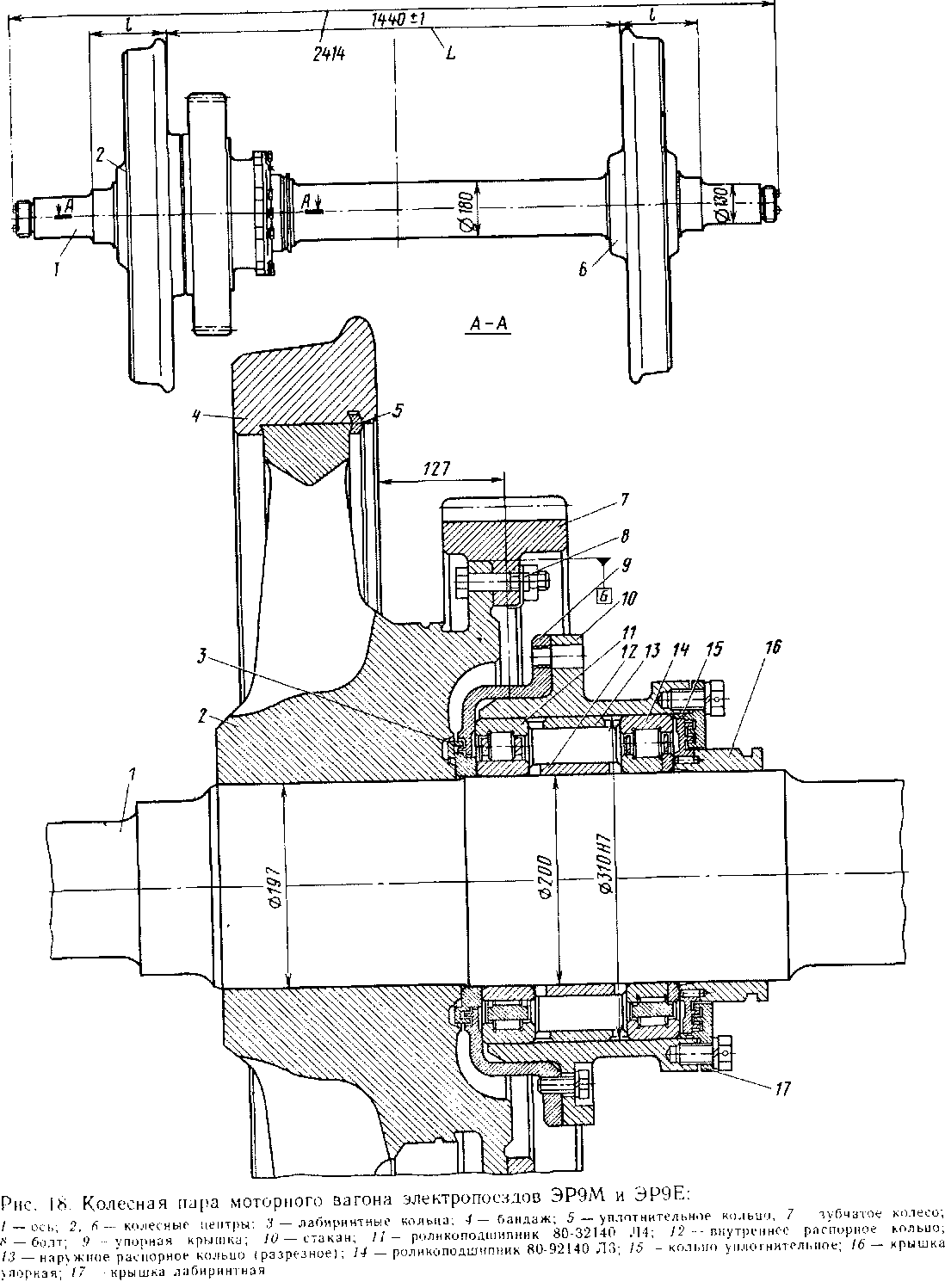 Основными элементами колесных пар являются: ось 1 (рис. 18), два колеса, зубчатое колесо 7 и подшипниковый узел корпуса редуктора тяговой передачи.