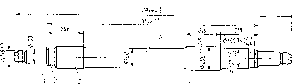 Ось колесной пары имеет несколько участков различного диаметра: буксовые шейки / (рис. 19), предподступичные части 2, подступичные части 3 для на-прессовки колесных центров, шейку 4 под подшипники опоры редуктора, среднюю часть 5. Для уменьшения концентрации напряжений переходы от одного диаметра к другому делают плавными с радиусами закругления не менее 20 мм. На торцах оси для закрепления ее в центрах станка и правильной обработки высверливают центровые конические отверстия. Оси моторных вагонов работают в тяжелых условиях при высоких знакопеременных нагрузках, поэтому их изготовляют из специальной мартеновской стали марки Ос.Л (осевая локомотивная), обладающей повышенными механическими свойствами. Оси 2 колесных пар прицепных вагонов (рис. 20) изготовляют ковкой или штамповкой из стали марки Ос.В (осевая вагонная). Для увеличения срока службы осей буксовые шейки, подступичные части, среднюю часть оси и их галтели подвергают поверхностному упрочнению накаткой роликами, имеющими сферическую поверхность.
