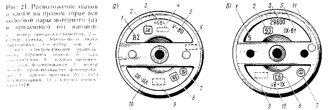 Клейма и знаки наносят на торце оси правой стороны колесной пары (рис. 21). Правой стороной колесной пары считают ту, на торце оси которой находятся знаки и клейма, относящиеся к изготовлению оси. Клейма и знаки на правом торце оси должны сохраняться на все время ее эксплуатации.