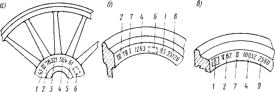 Рис. 22. Клейма и знаки формирования на ступице колесного центра \а), цельнокатаном колесе (б) и бандаже (я):